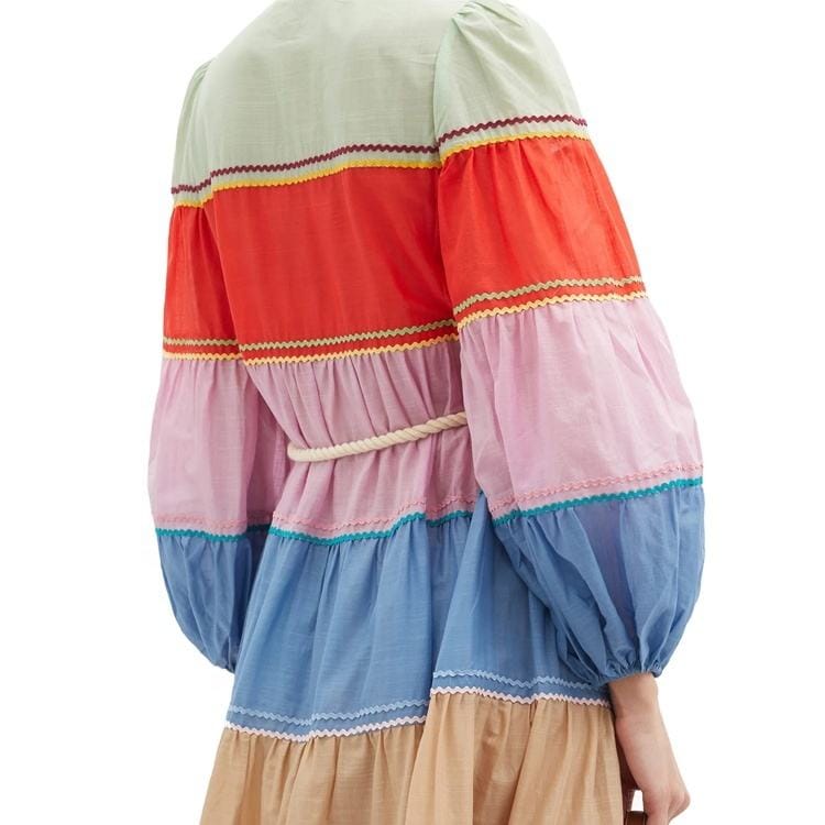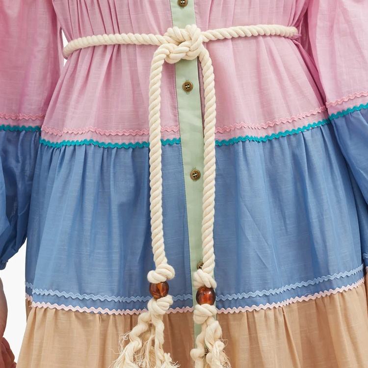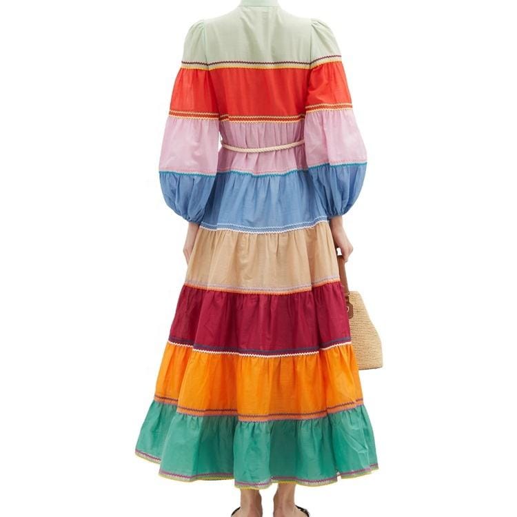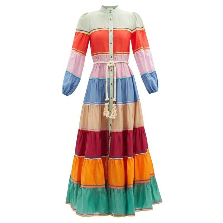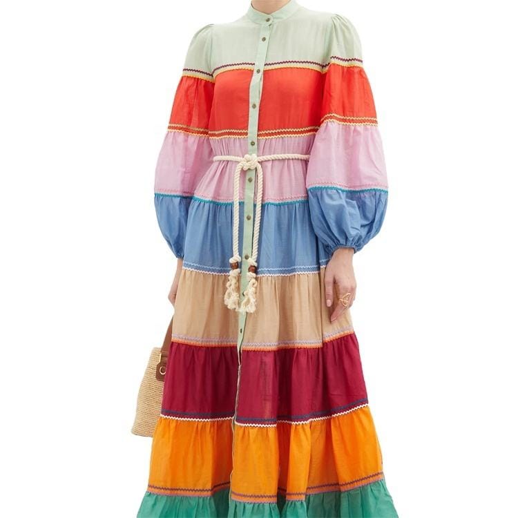 Crafted from 100% premium pre-washed cotton, this ankle-length maxi dress offers breathable, structured comfort with natural softness. The mandarin collar and long puff sleeves with elasticized cuffs create a polished yet playful silhouette, while the fitted button-through bodice releases into voluminous gathered tiers. The self-tie woven rope belt with tassel ends cinches the waist for adjustable definition. Available for color block maxi dress manufacturer and OEM/ODM orders with low 50-piece minimums — partner directly with our China clothing factory to develop your own rainbow collection.