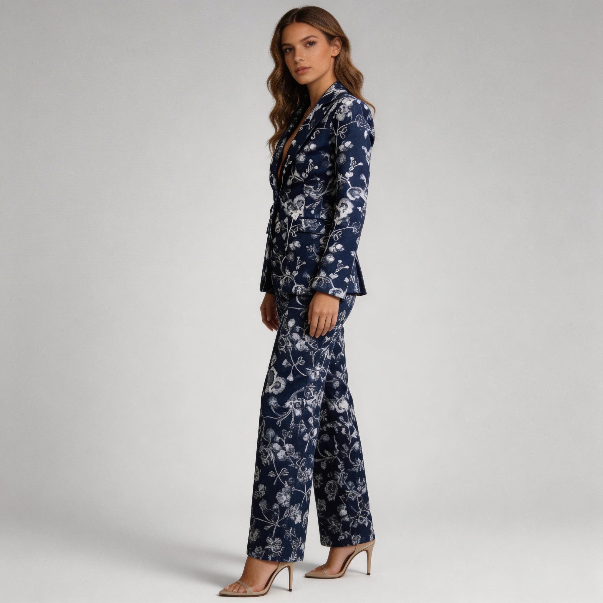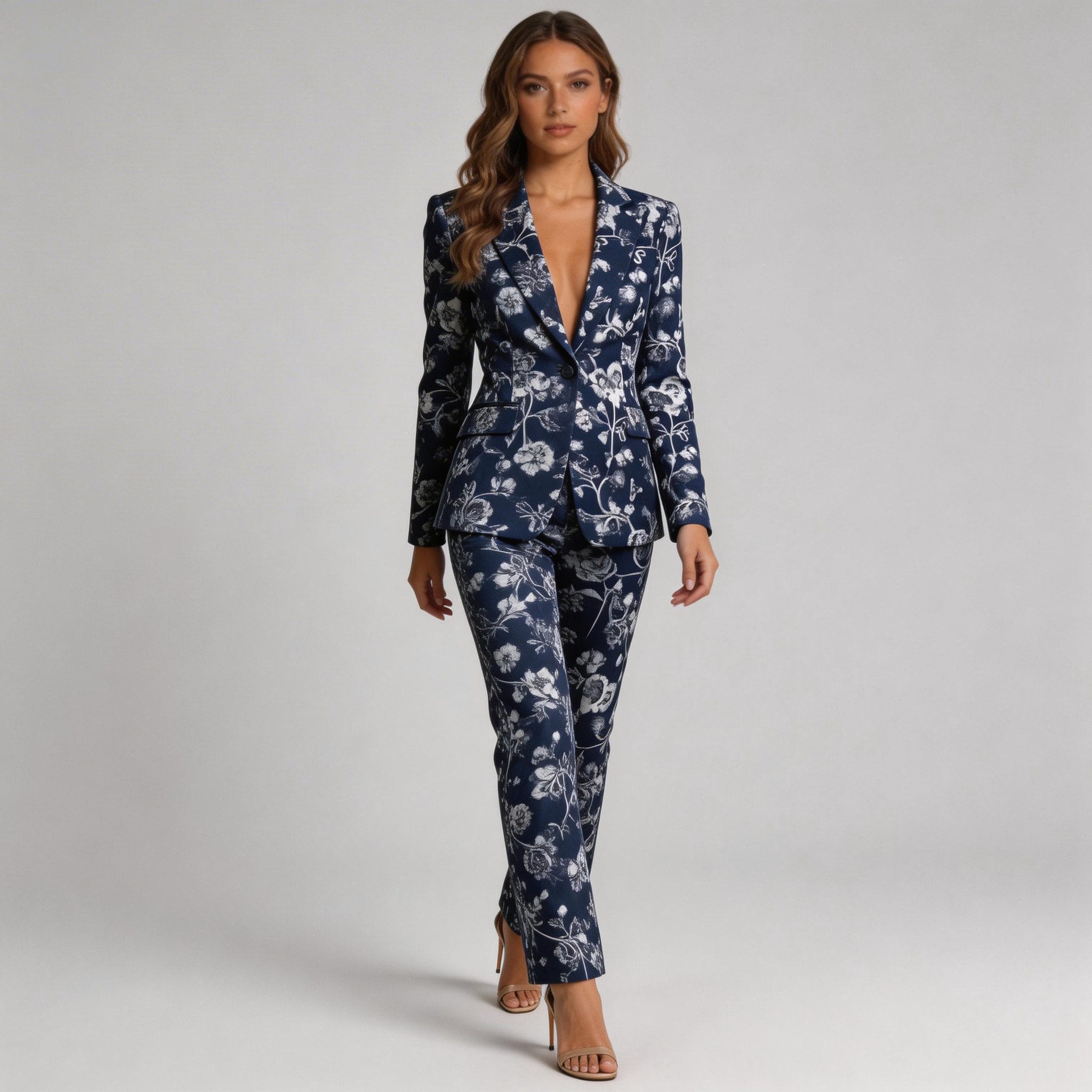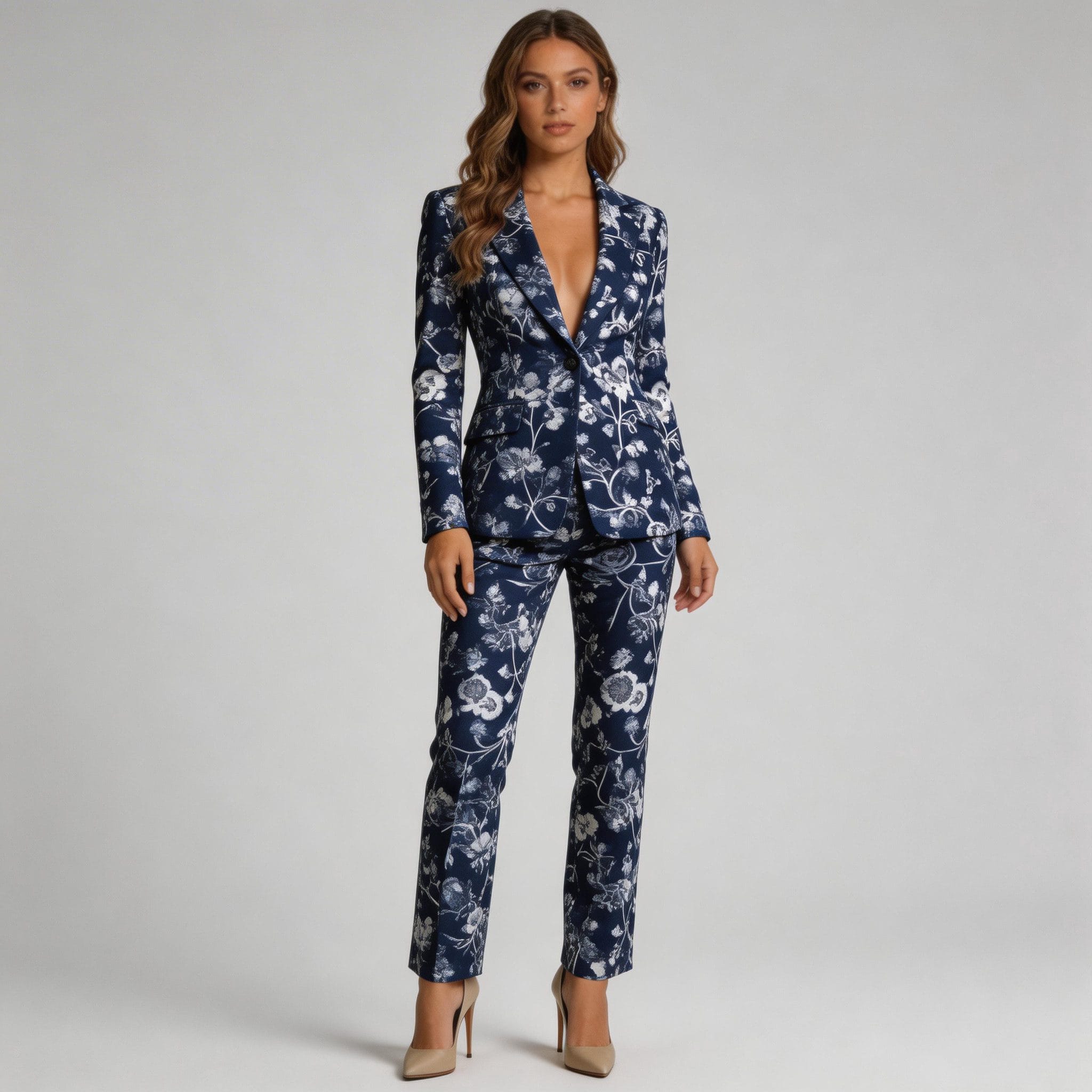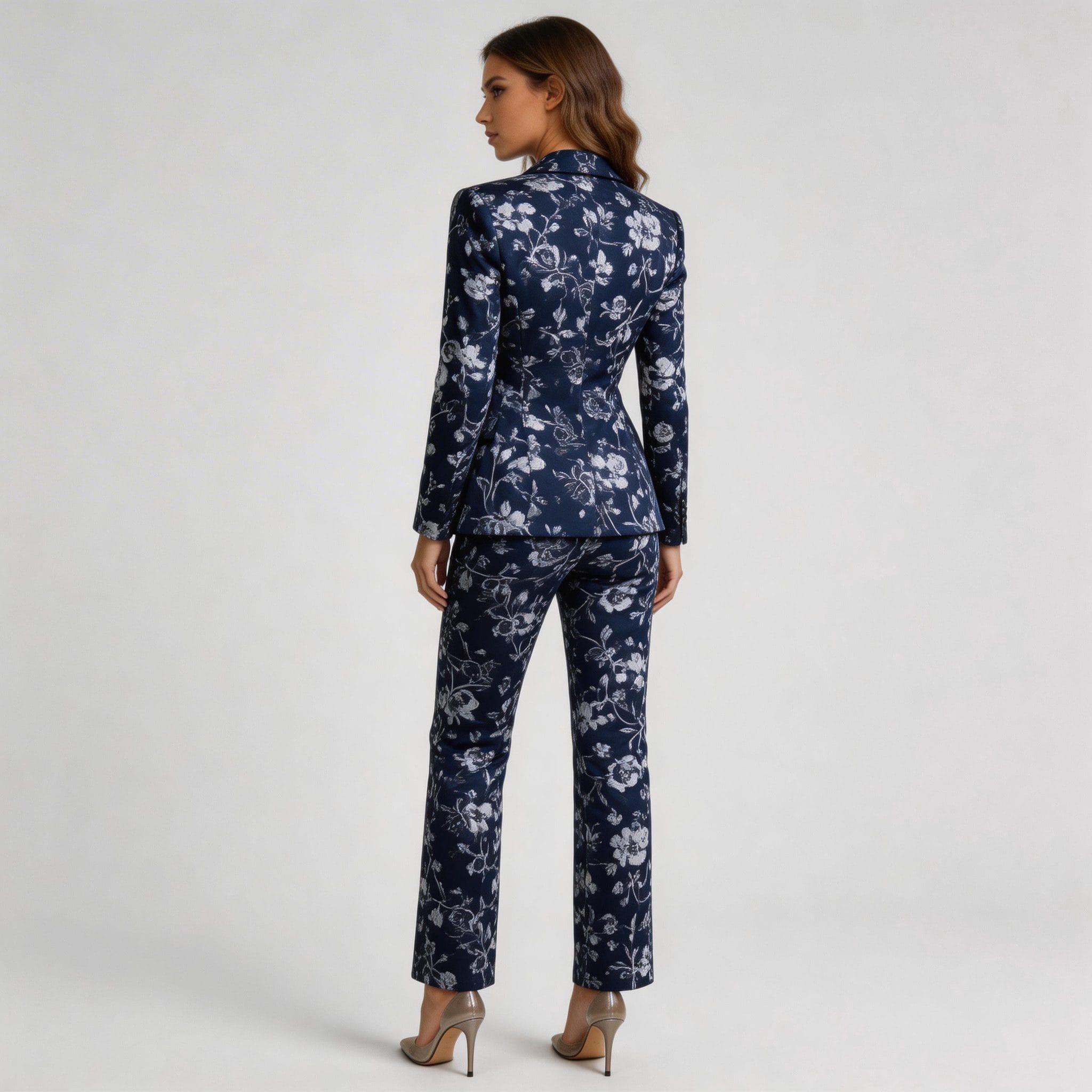 This navy floral suit is remarkably adaptable, suitable for both professional settings and special occasions. Wear it as a complete set for a cohesive, authoritative look at business meetings or formal events, or style the pieces separately to create varied outfits. Pair the jacket with jeans for a chic, contemporary vibe, or the pants with a simple blouse for a sophisticated ensemble. The classic cut and timeless print flatter multiple body types, embodying current fashion design trends.