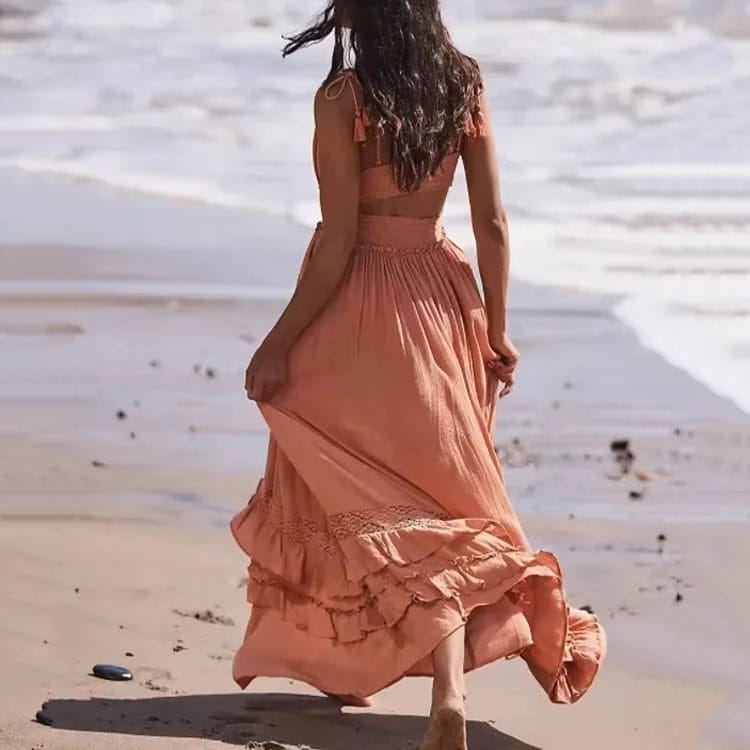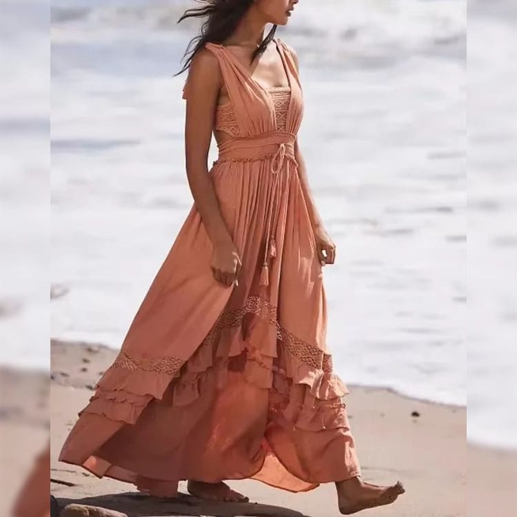 Our cut out maxi dress manufacturer program delivers premium women’s resort dresses with daring open-back elegance and flowing bohemian movement. As a dedicated China clothing factory with 22 years of OEM/ODM expertise, this cut out maxi dress manufacturer option showcases a warm terracotta viscose base with a smocked square-neck bodice, dramatic open back with adjustable corset-style tie straps, and a flirtatious waist cut-out. The gathered tiered skirt cascades to the ankle with delicate lace-trim ruffle edges, creating a head-turning vacation statement that elevates boutique collections above standard solid maxi dresses.