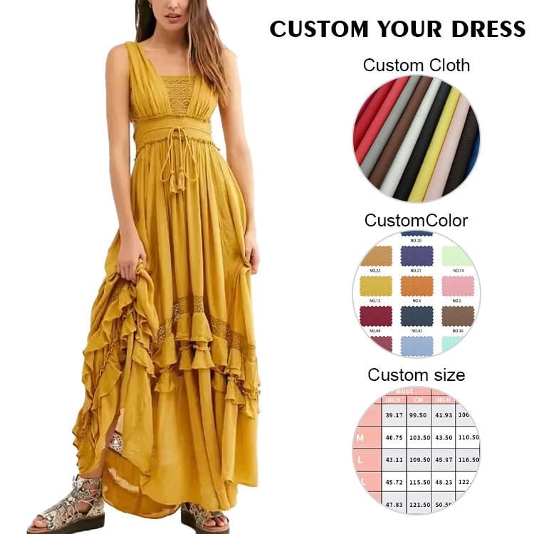 Crafted from 100% premium viscose, this ankle-length maxi dress offers breathable, lightweight comfort with natural fluid movement. The smocked front bodice stretches for a comfortable, flexible fit, while the open back with tie straps allows adjustable tension and customizable styling. The exposed waist cut-out adds modern allure, and the tiered ruffle hem with lace detailing creates romantic volume and beach-ready charm. Available in terracotta, mustard, and custom colorways for cut out maxi dress manufacturer and OEM/ODM orders with low 50-piece minimums.
