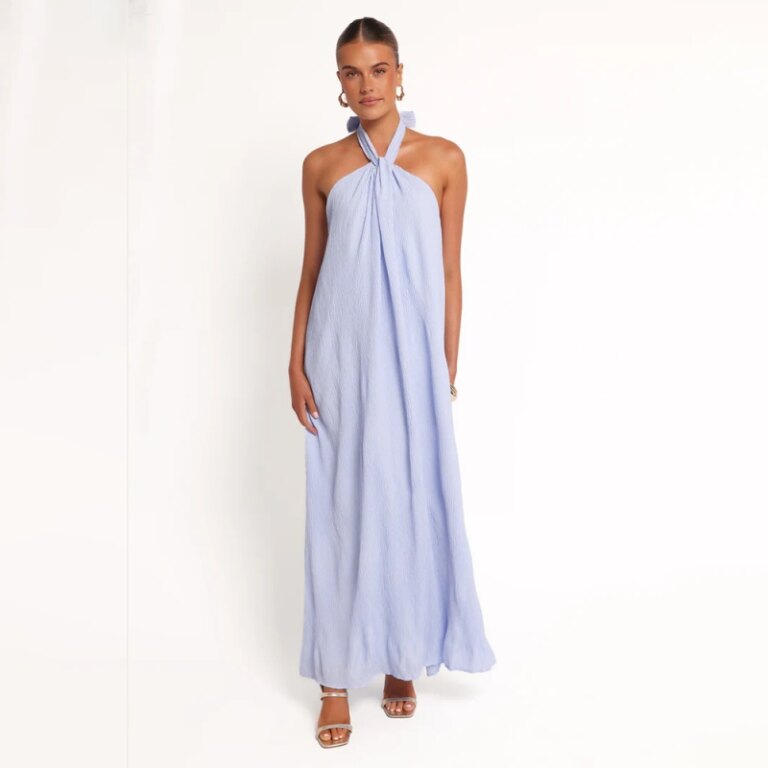 Detailed Product Description Bohemian Texture Style Solid – color V – Neck Sleeveless Maxi Dress Step gracefully into the realm of bohemian allure with this