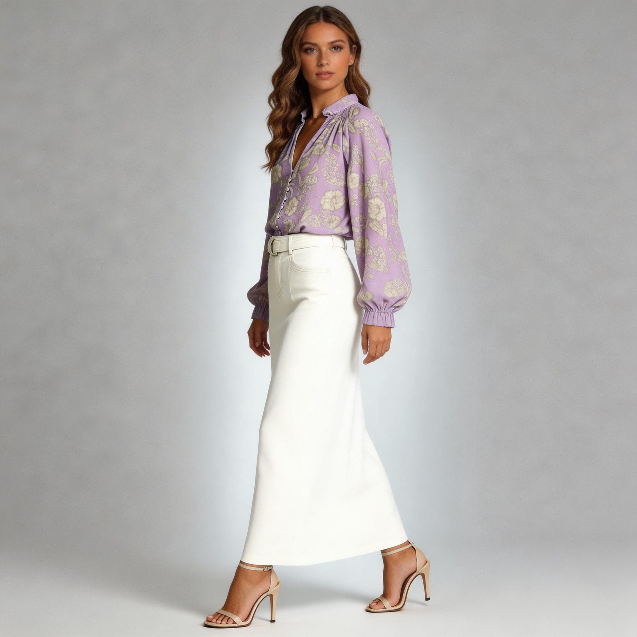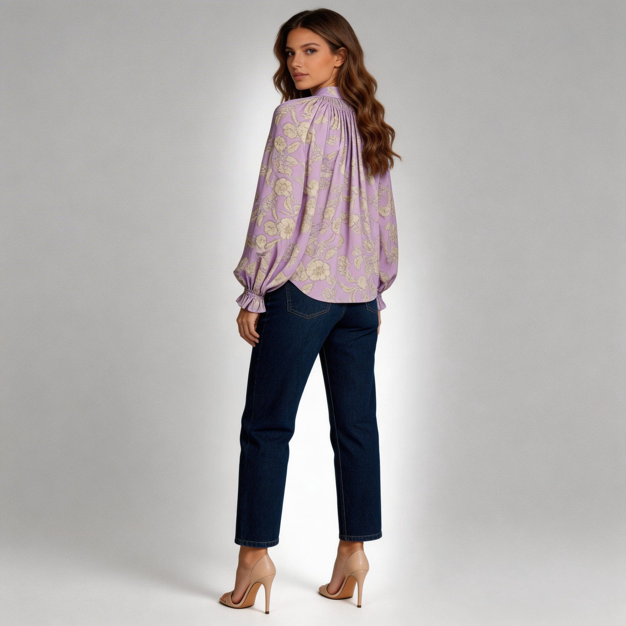 Floral Pattern:This elegant blouse features a sophisticated floral print in soft, creamy hues against a lavender background. The delicate flowers add a touch of vintage charm and feminine elegance, making it a perfect choice for spring and summer fashion.