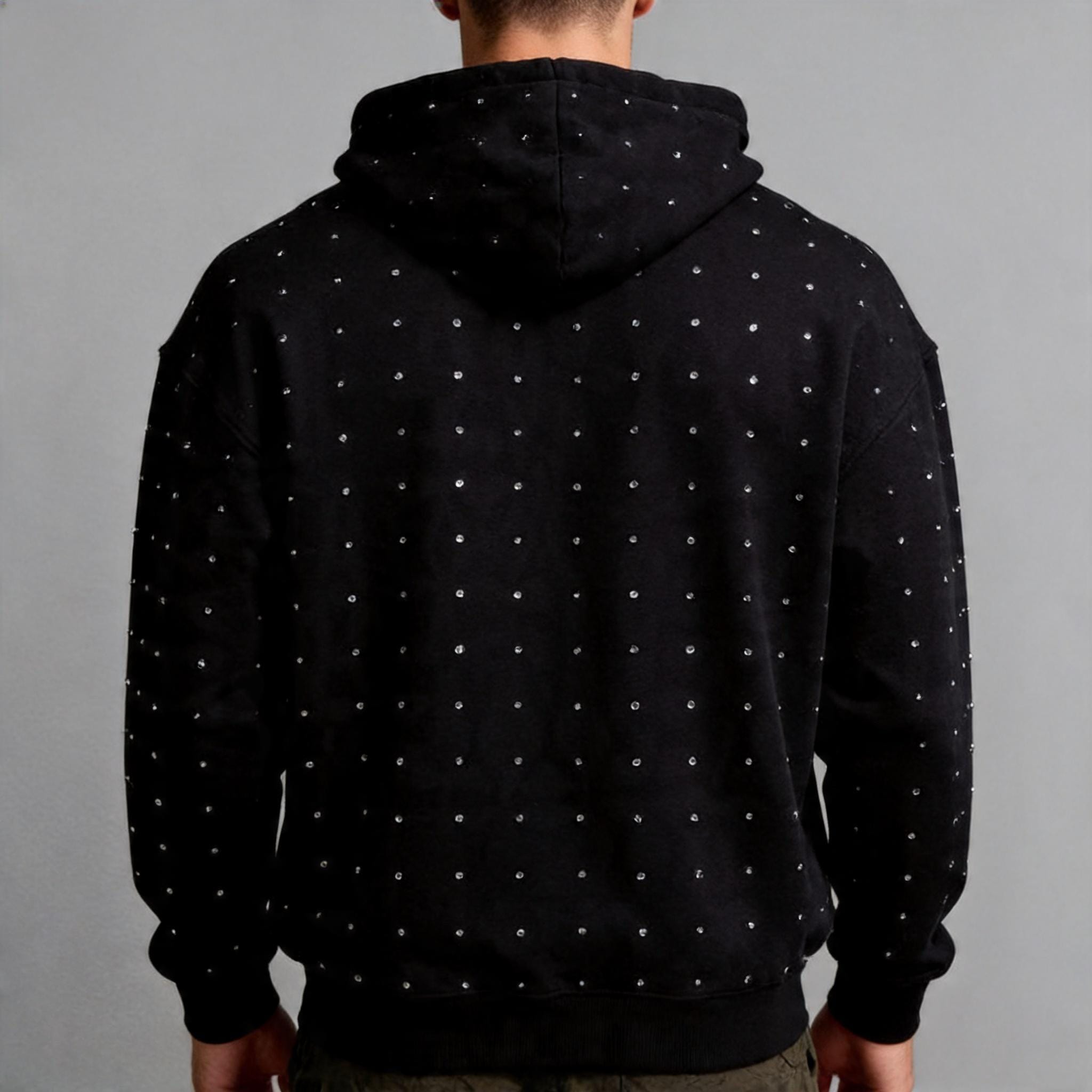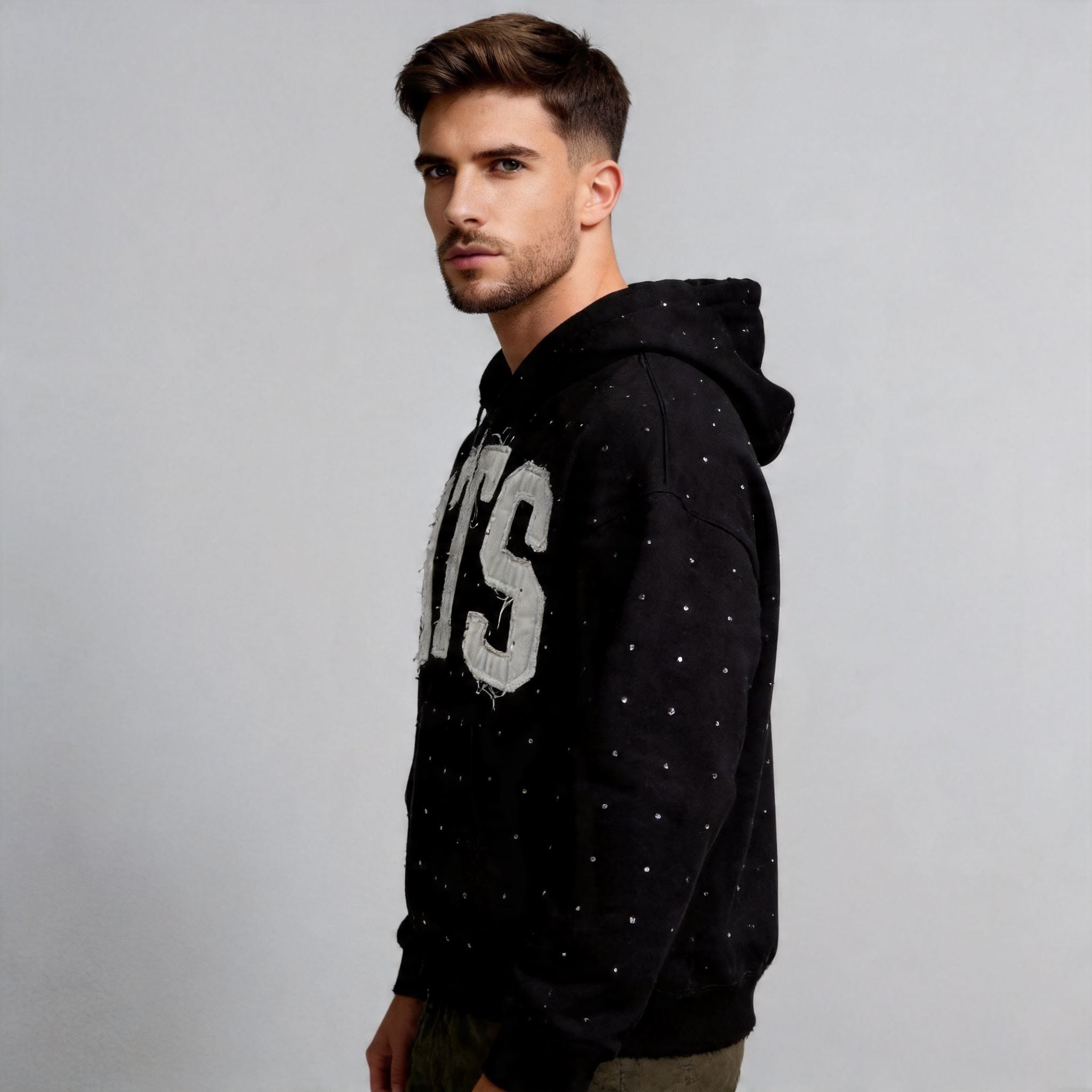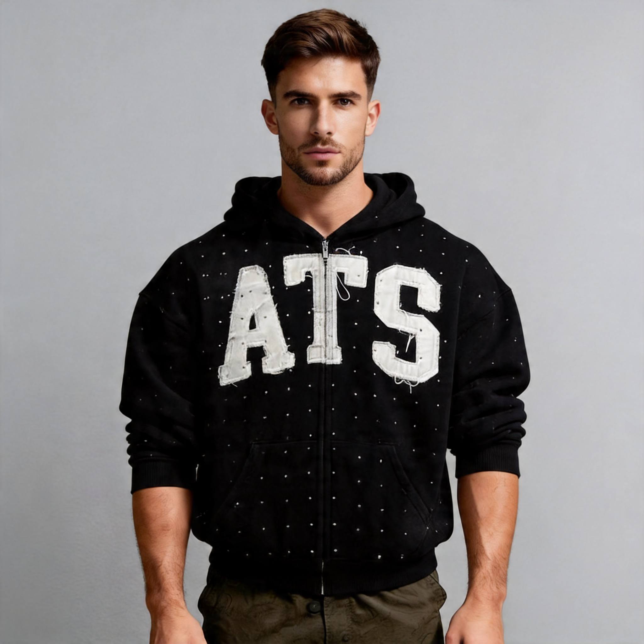 This ATS studded distressed hooded zip-up hoodie for men is a perfect blend of edgy style and comfort. Featuring a bold “ATS” letter patch on the front, all-over studded detailing, and a relaxed fit, this hoodie is ideal for streetwear enthusiasts and fashion-forward individuals. Made with heavyweight cotton, it offers durability and a premium feel. Perfect for casual outings or making a statement. Available for OEM & wholesale orders with low MOQ (100 pieces).