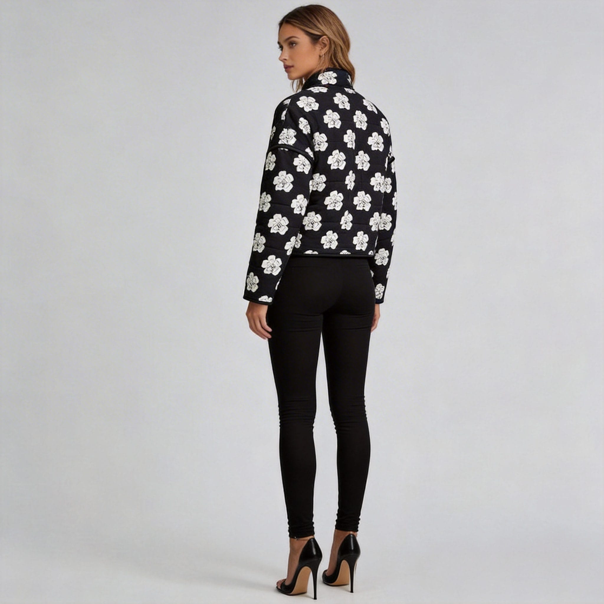Pair with Black Pants: For a chic and sophisticated look, pair this floral print quilted jacket with black pants. This combination creates a sleek and polished ensemble, perfect for office settings or evening events. Add a pair of heels to elevate the look.