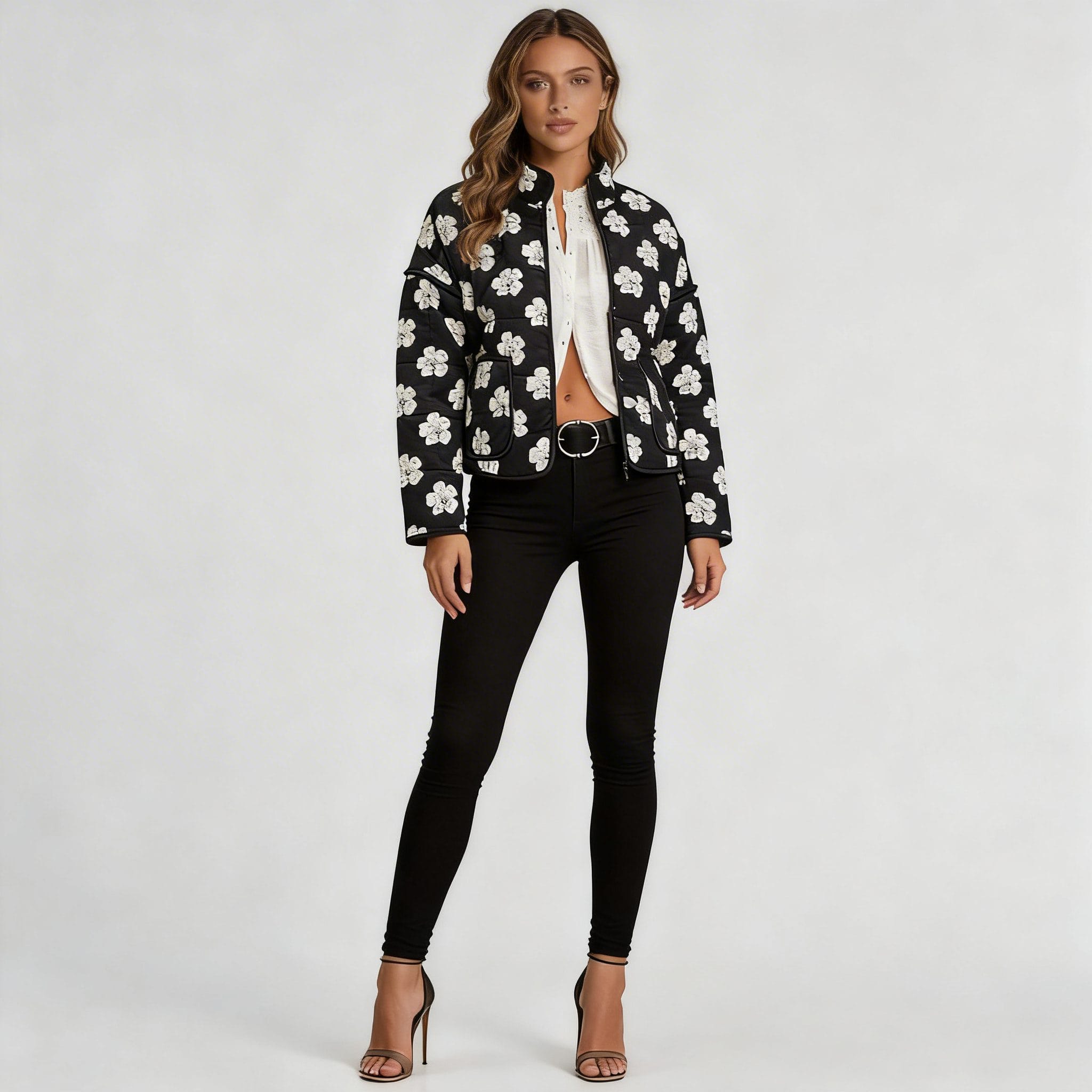 Floral Print: This jacket features an eye-catching floral print that adds a touch of femininity and elegance. The white flowers on a black background create a striking contrast, making it a standout piece in any outfit.