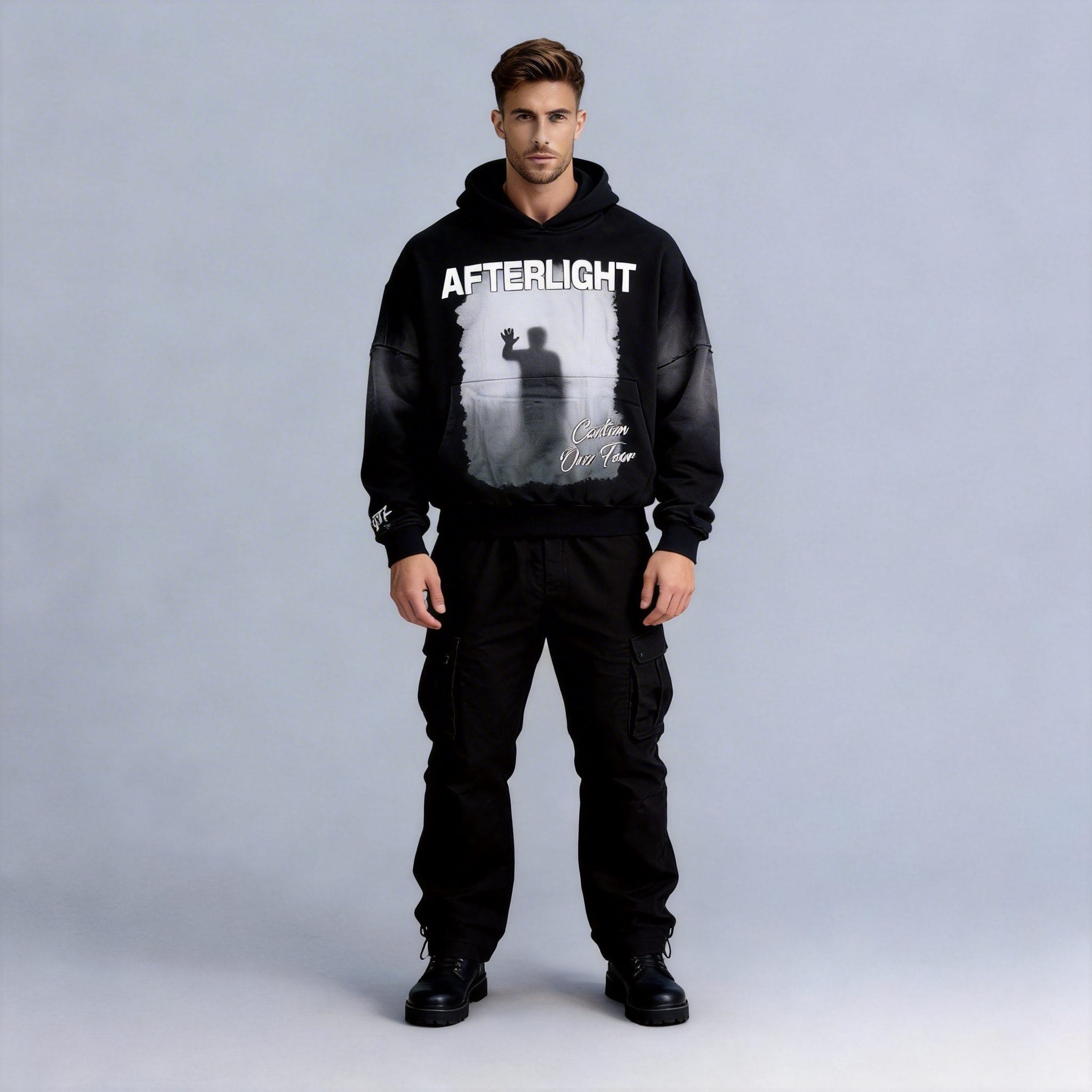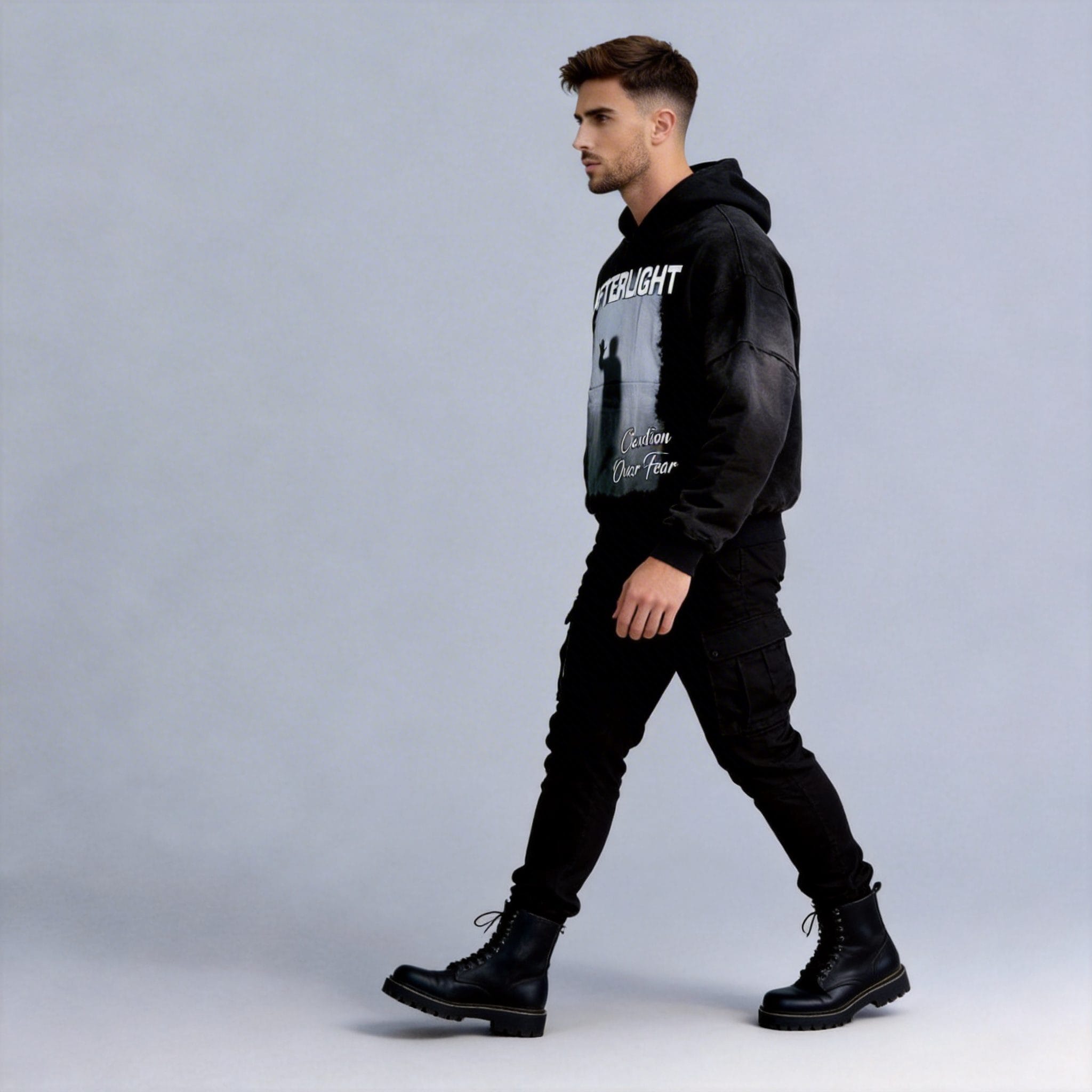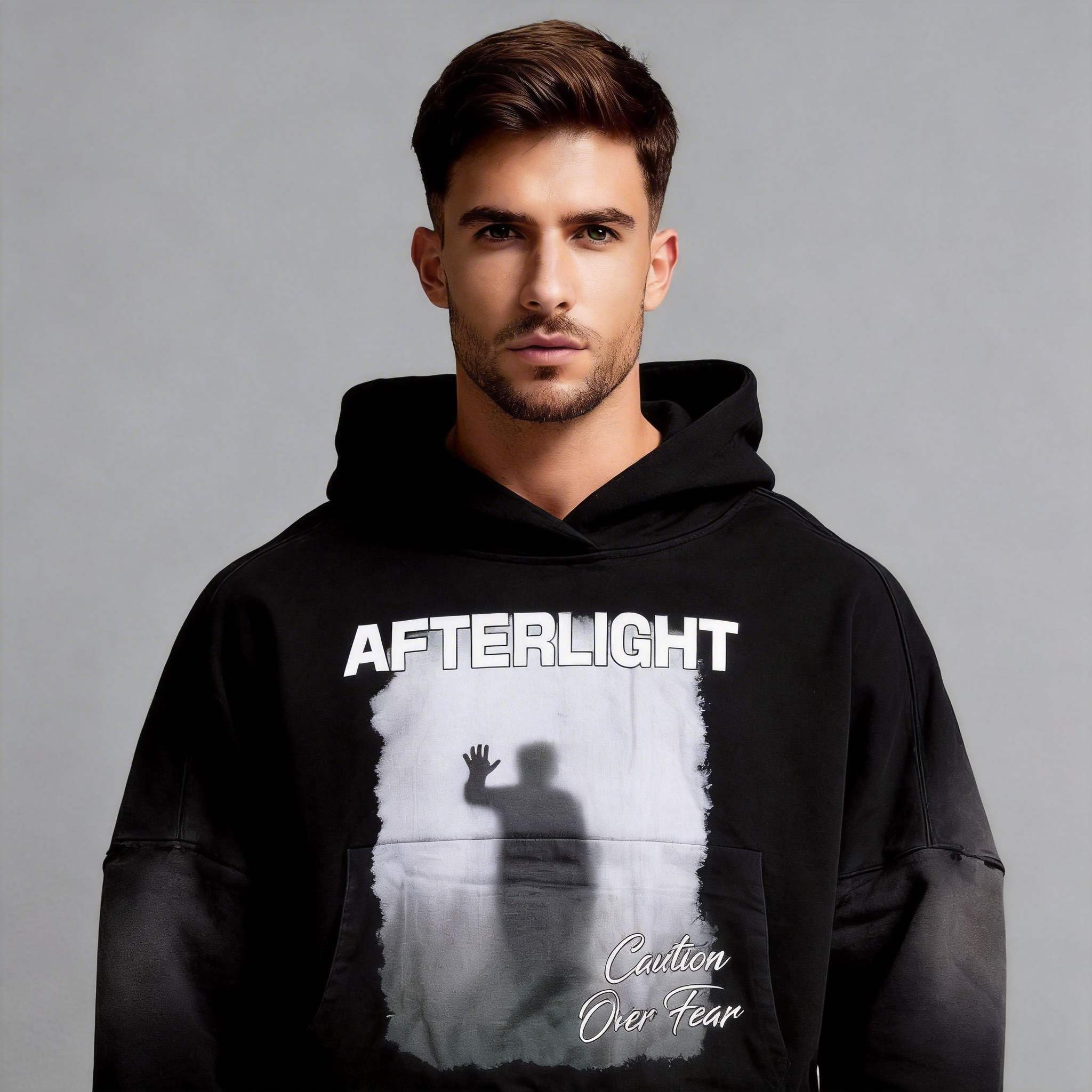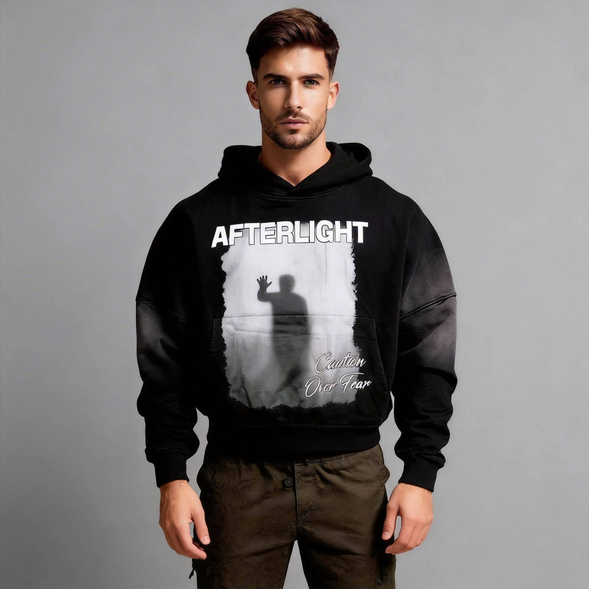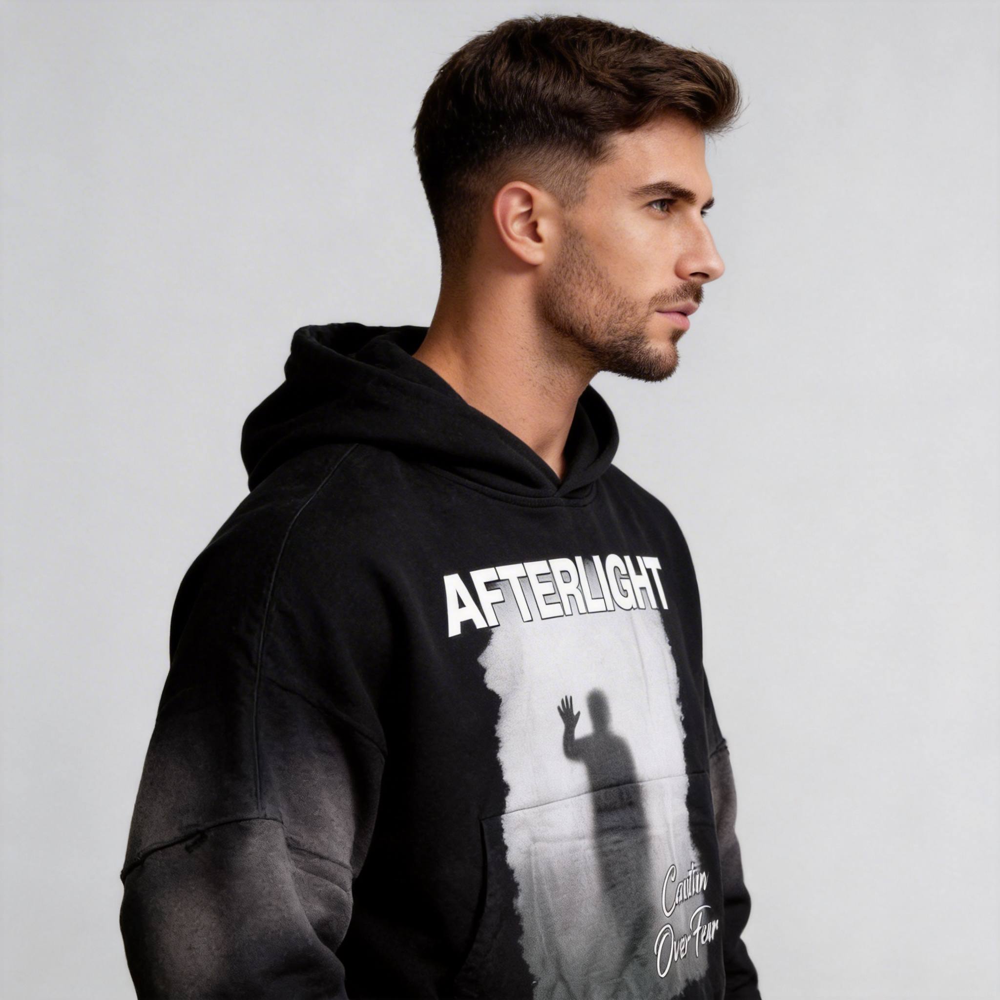 Introducing the Afterlight Caution Over Fear Hoodie – a bold statement piece for your streetwear collection. This hoodie features a striking graphic design with a silhouette against an ethereal background, paired with the powerful message “AFTERLIGHT” and “Caution Over Fear.” Crafted for comfort and style, this hoodie is perfect for making a statement in urban environments or casual gatherings. Available for OEM & wholesale orders with low MOQ.