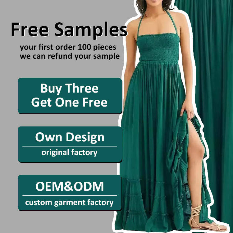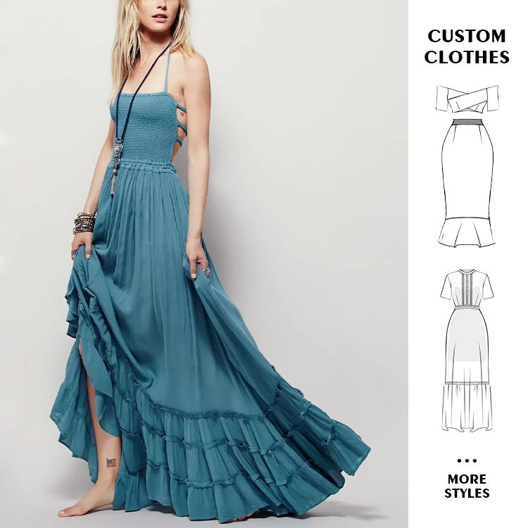 Floor-length dress with a halter neck or strapless design. The high-waist cut, often accentuated with seams or drawstrings, creates a flattering and elongated silhouette that flows elegantly with every step, embodying the long dress style.