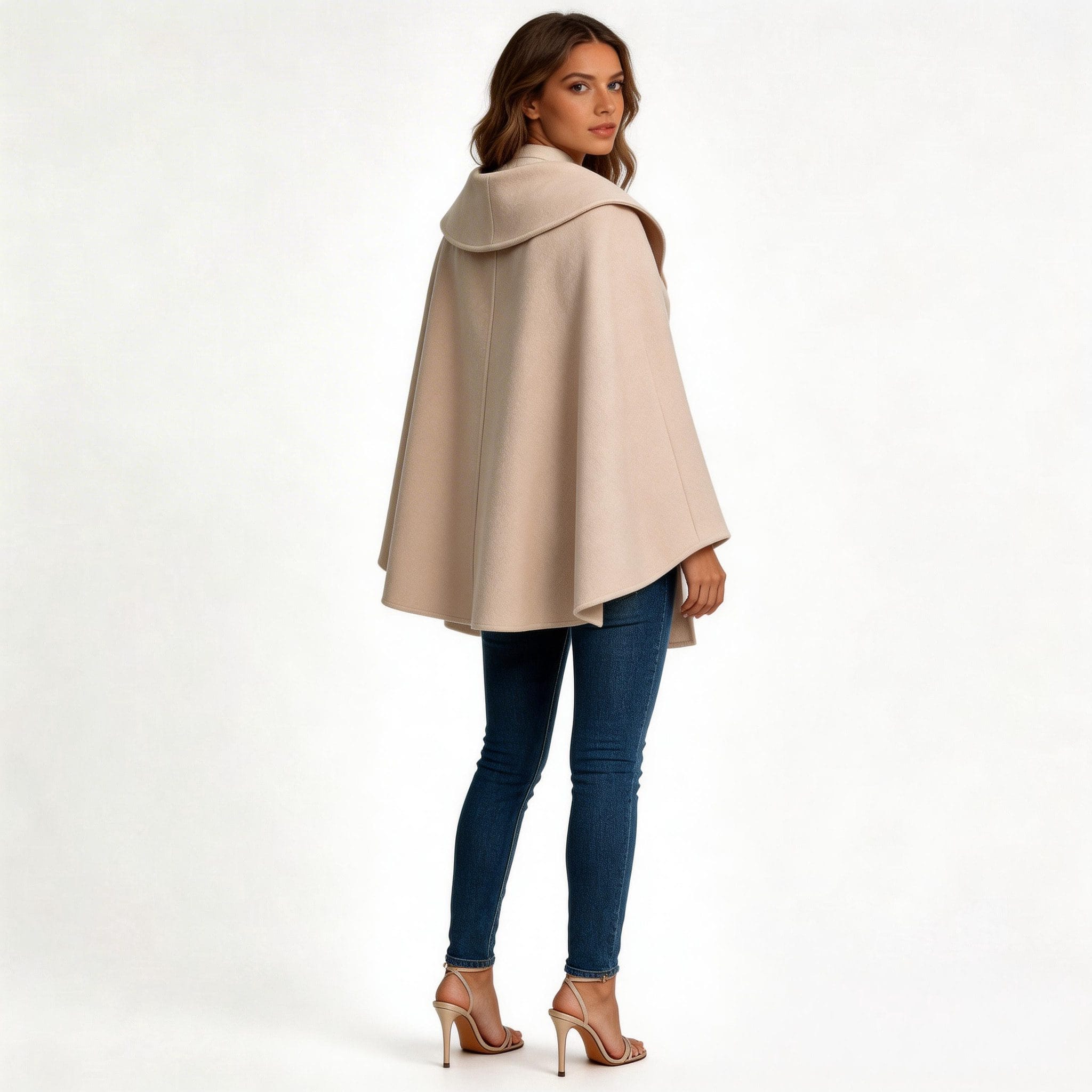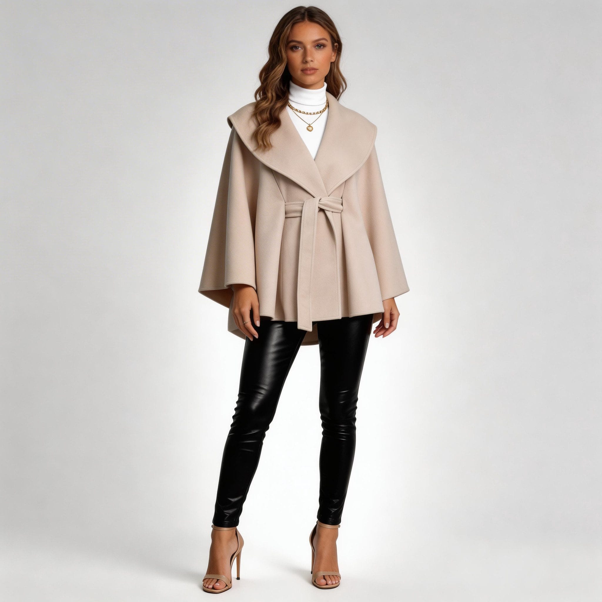 This elegant belted cape in soft beige is a must-have for any fashion-conscious woman. Its timeless design, comfortable fabric, and versatile styling options make it suitable for a range of occasions, from casual outings to formal events. Embrace the sophisticated charm and elevate your winter wardrobe with this exquisite piece.