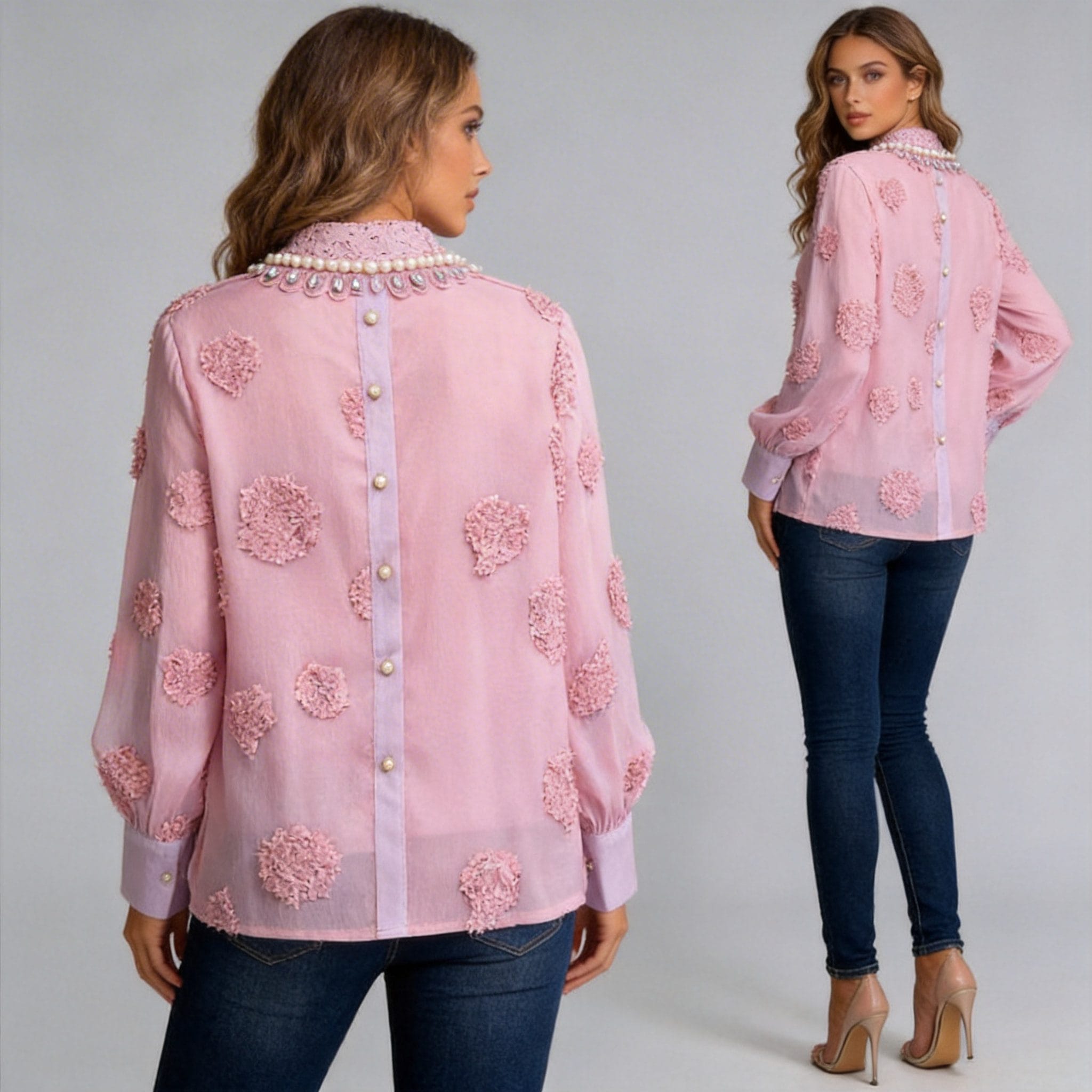 Pearl-Embellished Collar: The pearl-embellished collar enhances the blouse’s luxurious appeal. The pearls add a classic and refined element, framing the neckline beautifully.