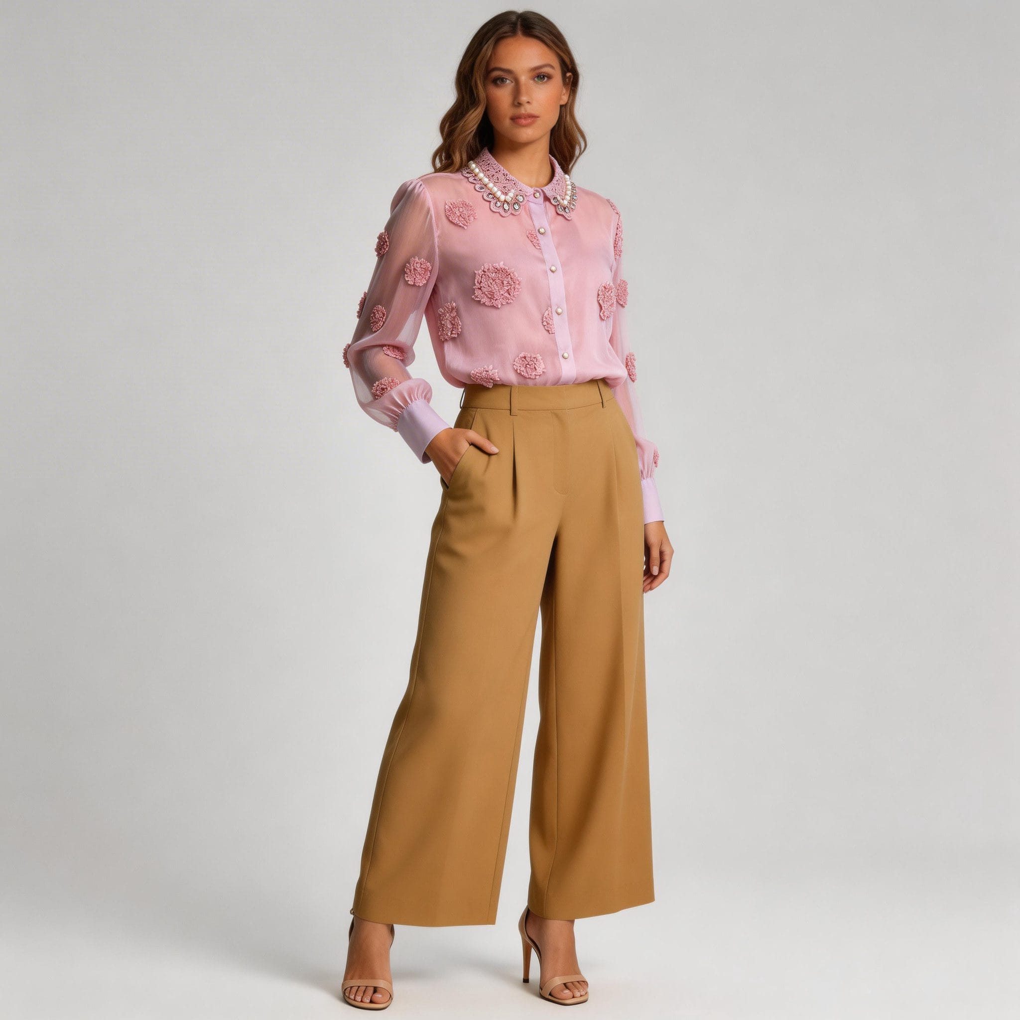 Match with Beige Wide-Leg Trousers: For a sophisticated and relaxed appearance, pair the blouse with beige wide-leg trousers. This ensemble is suitable for summer events, garden parties, or lunch dates.