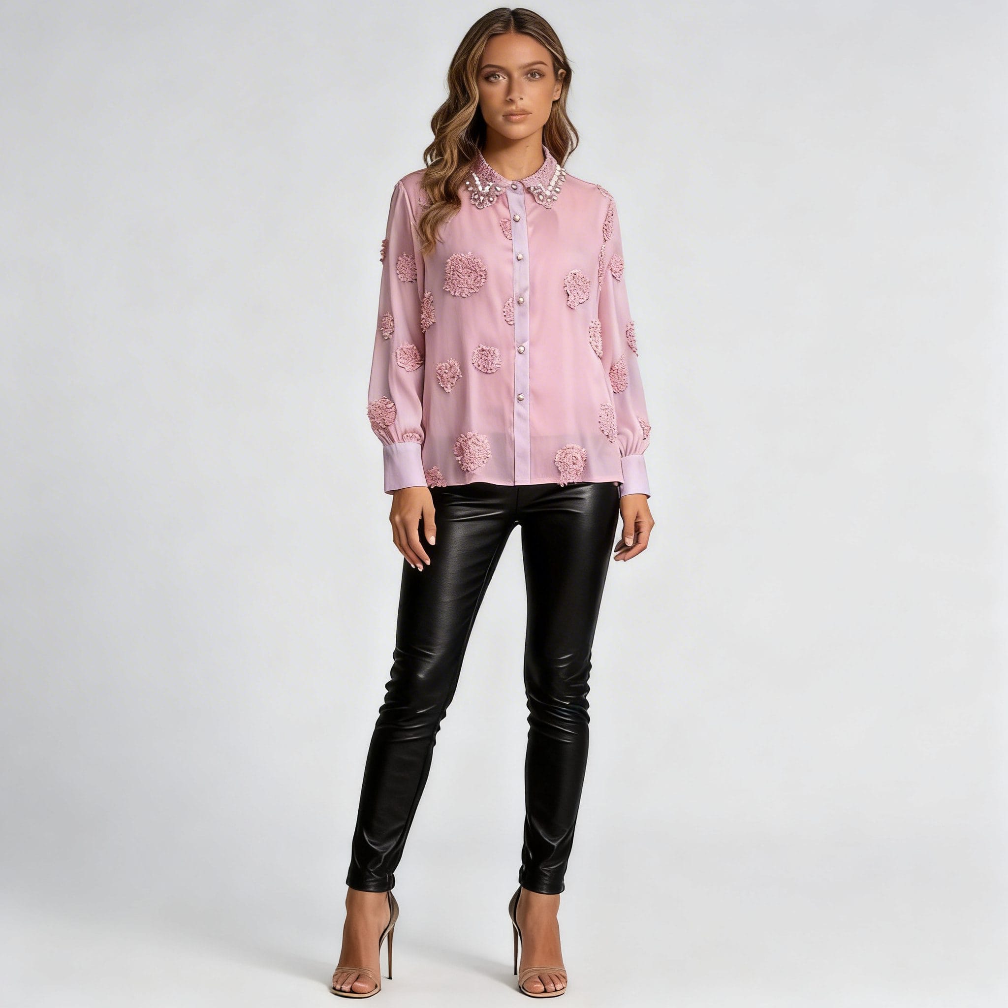 Pair with Black Leather Pants: For an edgy yet chic look, pair this pink embellished blouse with black leather pants. This combination balances the blouse’s femininity with a modern, rock-inspired vibe.