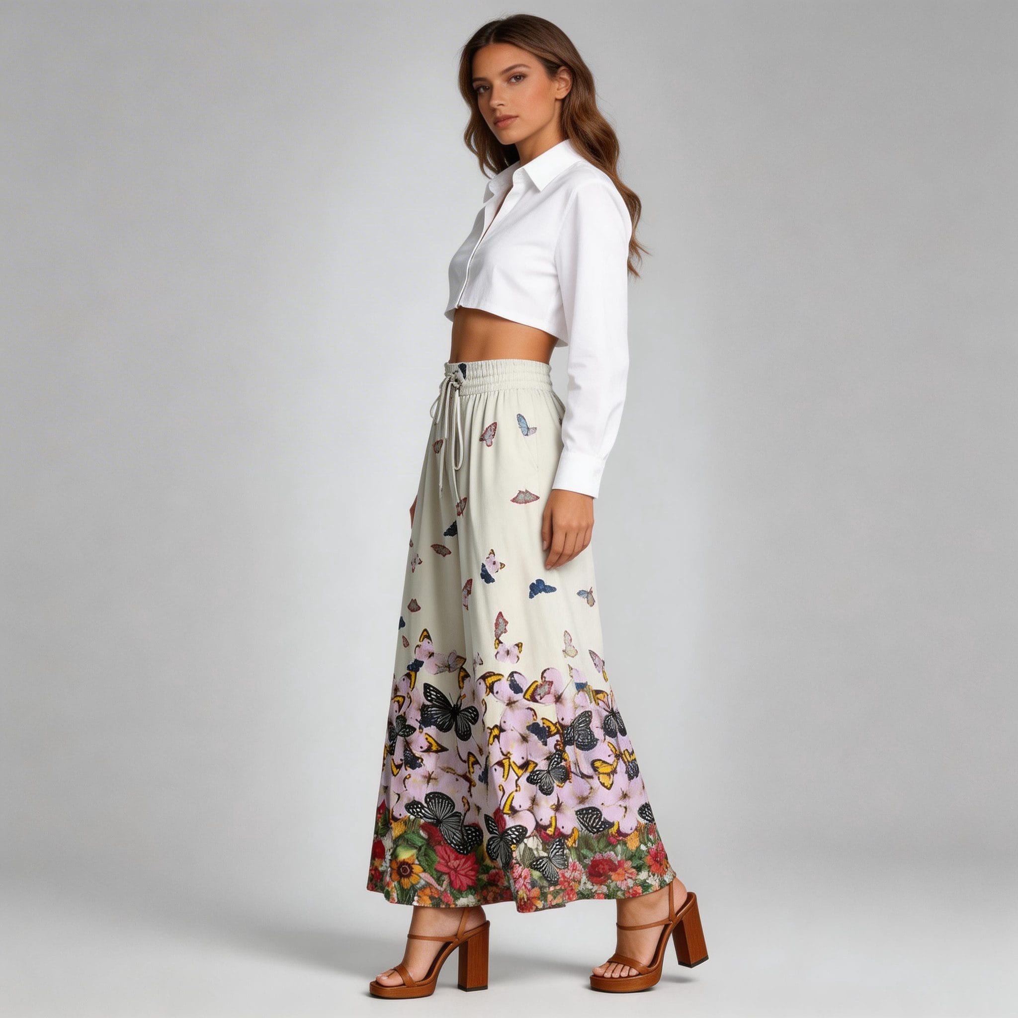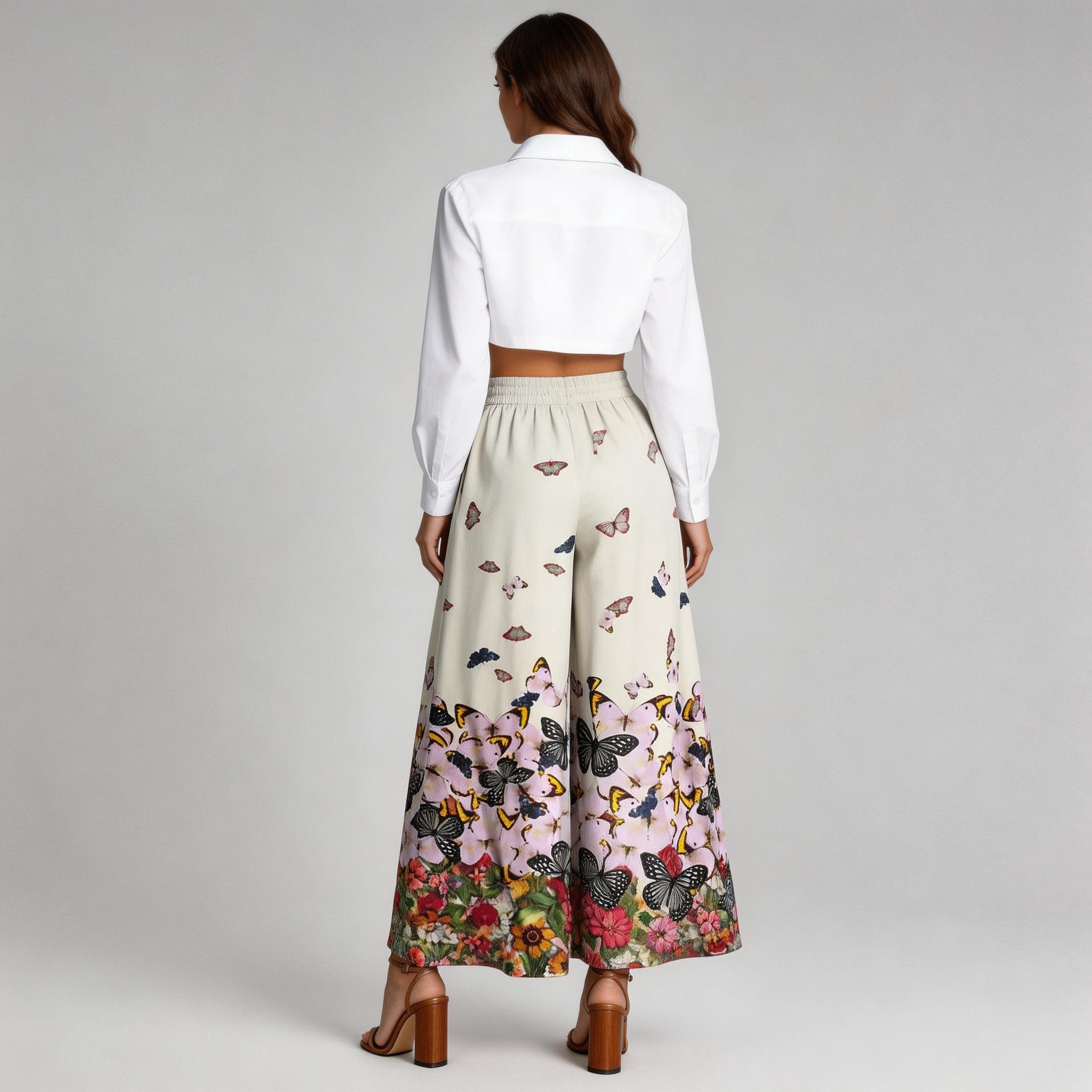 Pair these butterfly print pants with a crisp white cropped shirt for a fresh and elegant look. Combine them with a light pink tank top and sandals for a soft, romantic vibe. Elevate the outfit with nude heels and delicate jewelry for a more sophisticated appearance.