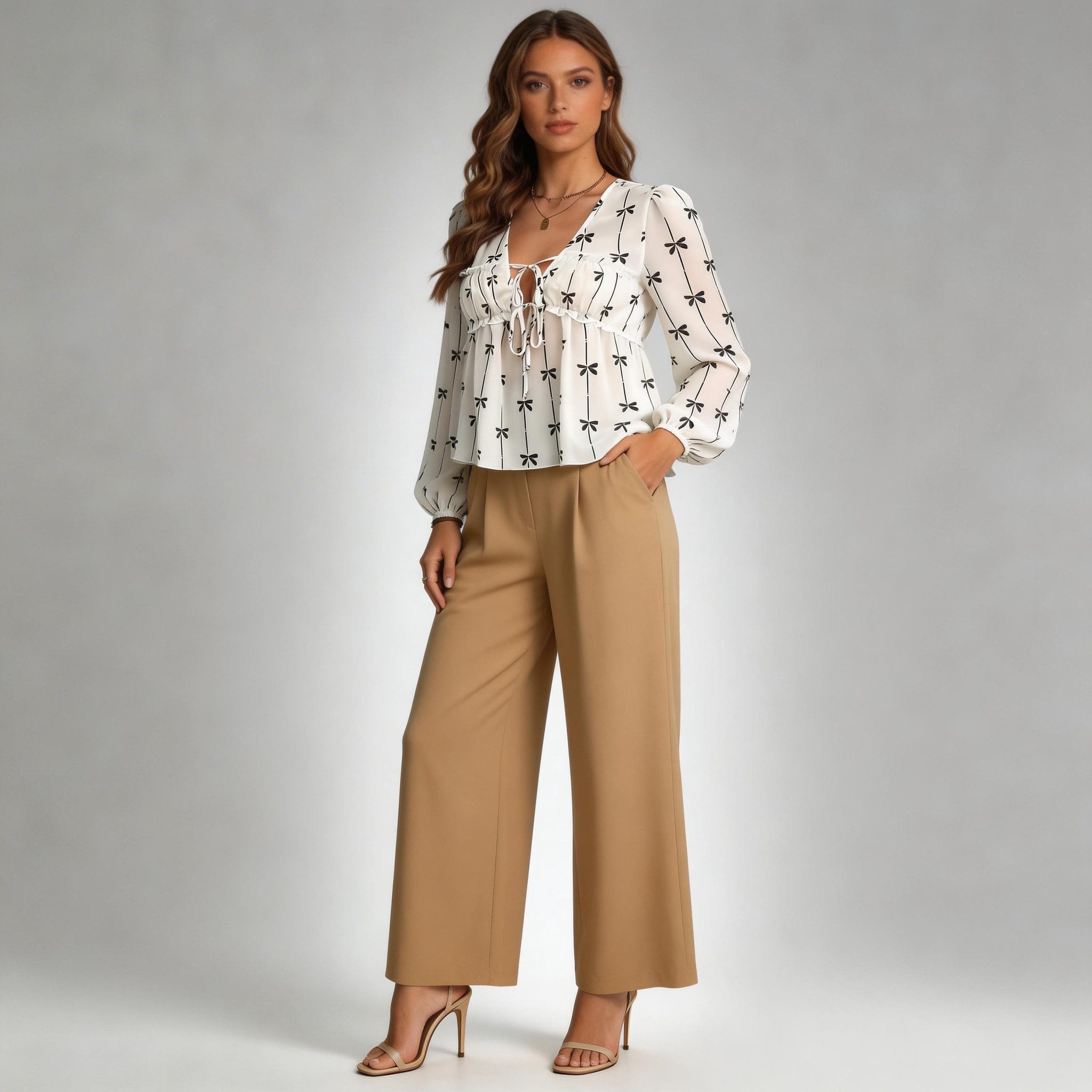 Combine with Wide-Leg Trousers: Create a professional, chic ensemble by wearing the blouse with beige wide-leg trousers. This combination is ideal for office settings or business meetings, offering a blend of style and sophistication.