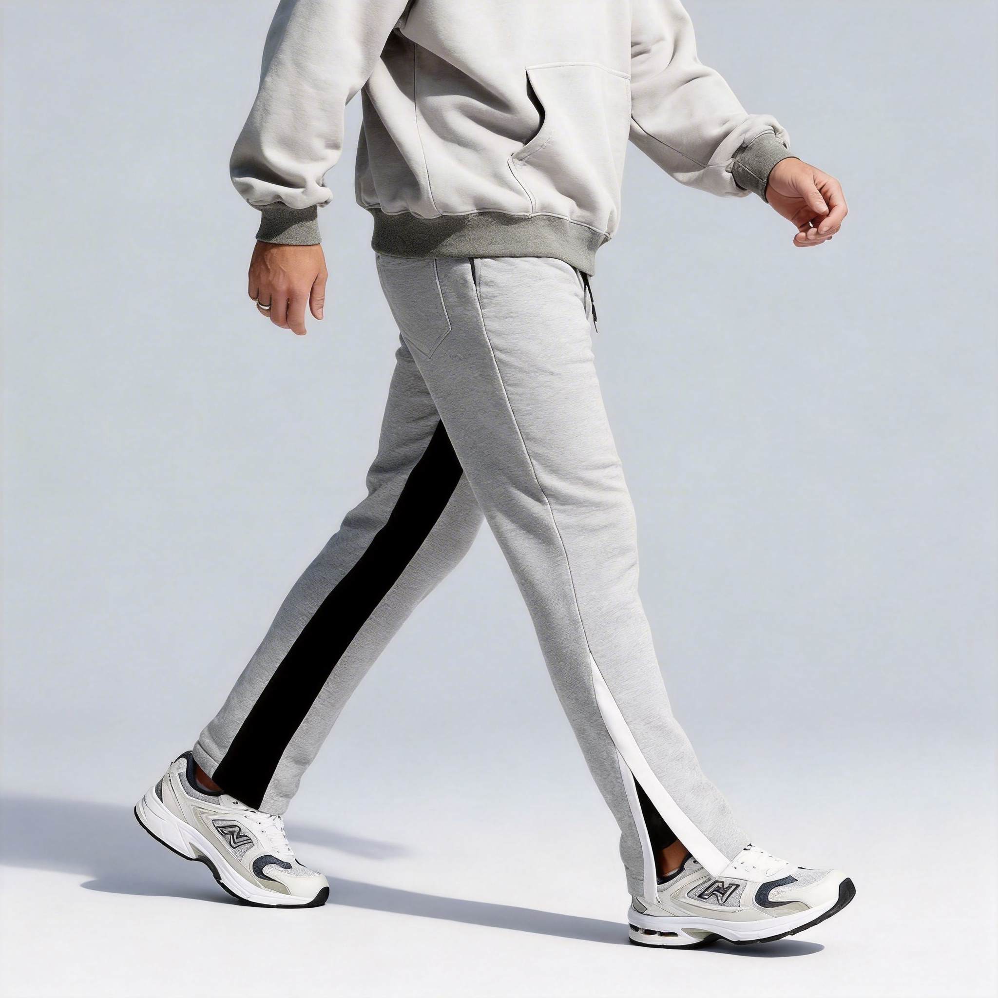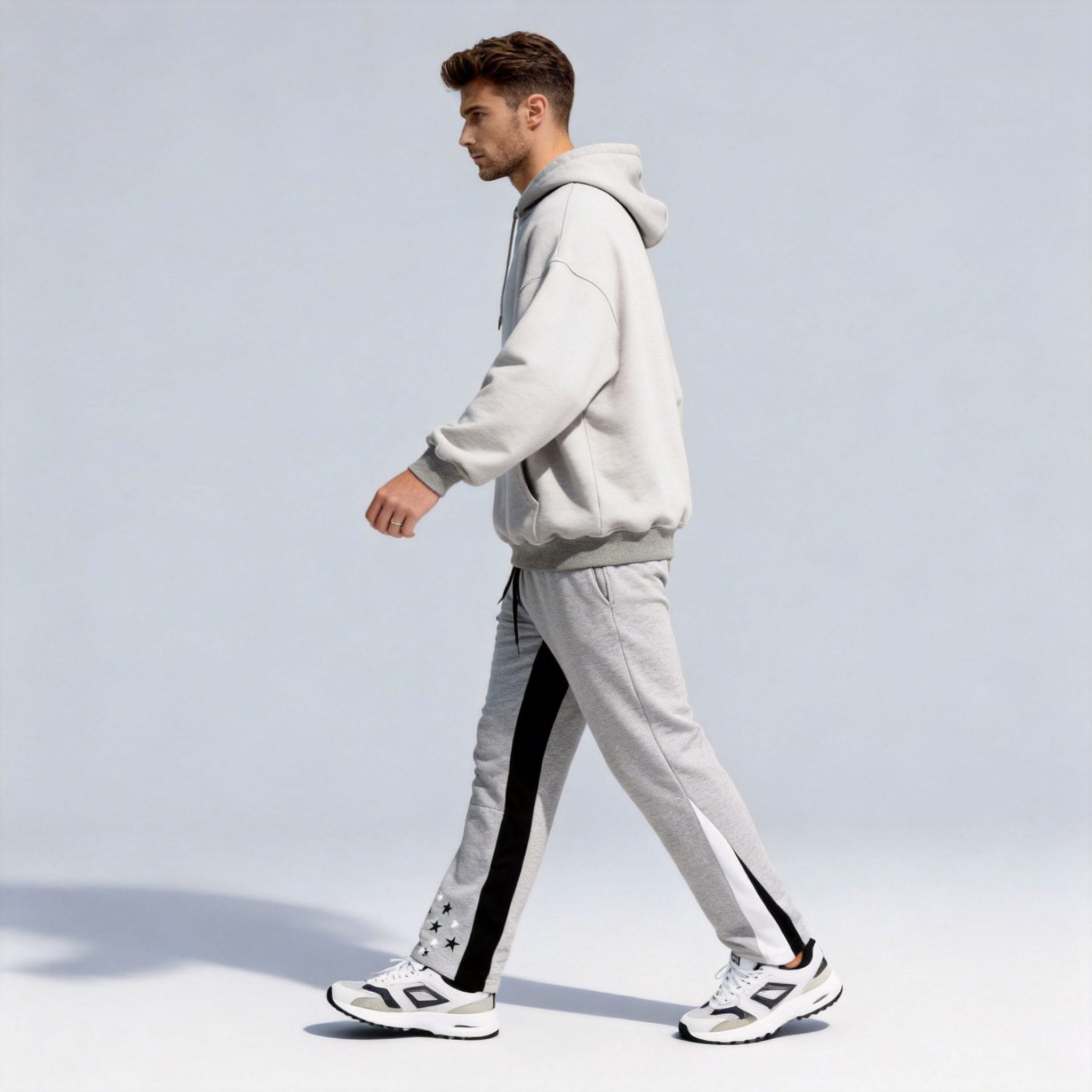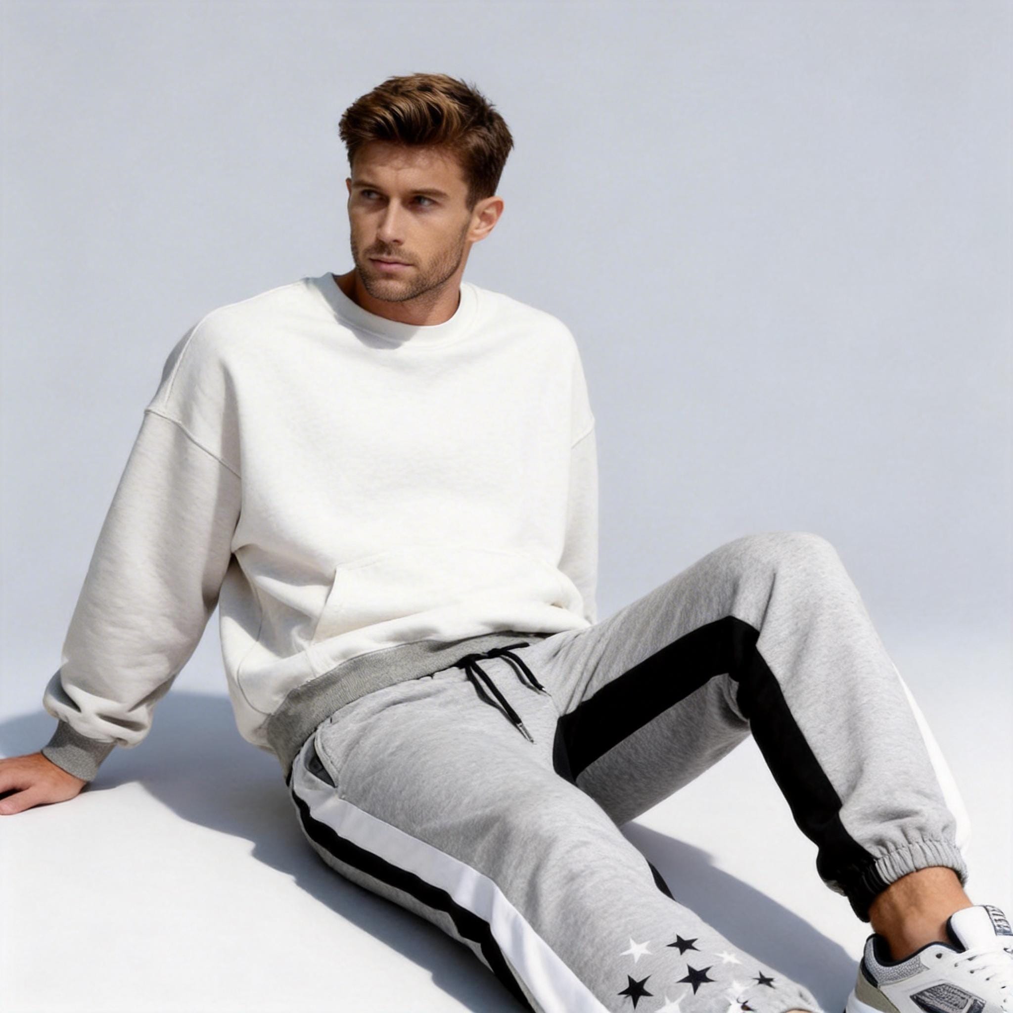 Elevate your loungewear with our men’s classic sweatpants. Crafted from a premium cotton blend, these sweatpants offer unparalleled comfort and a relaxed fit. Featuring stylish black and white side stripes and a subtle star pattern near the ankles, these sweatpants add a modern twist to the classic design. Perfect for lounging at home, running errands, or light workouts, these sweatpants are a versatile essential. Available for OEM & wholesale orders with a low MOQ of 100 pieces.