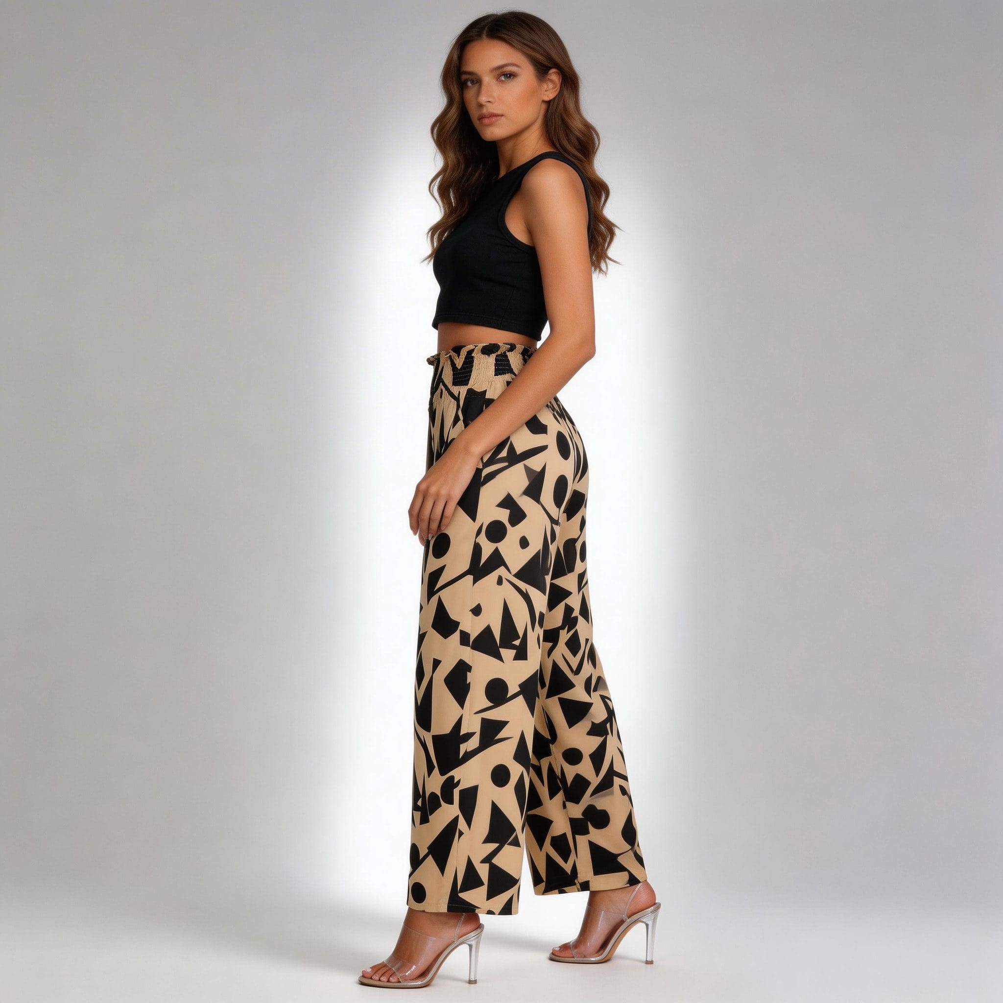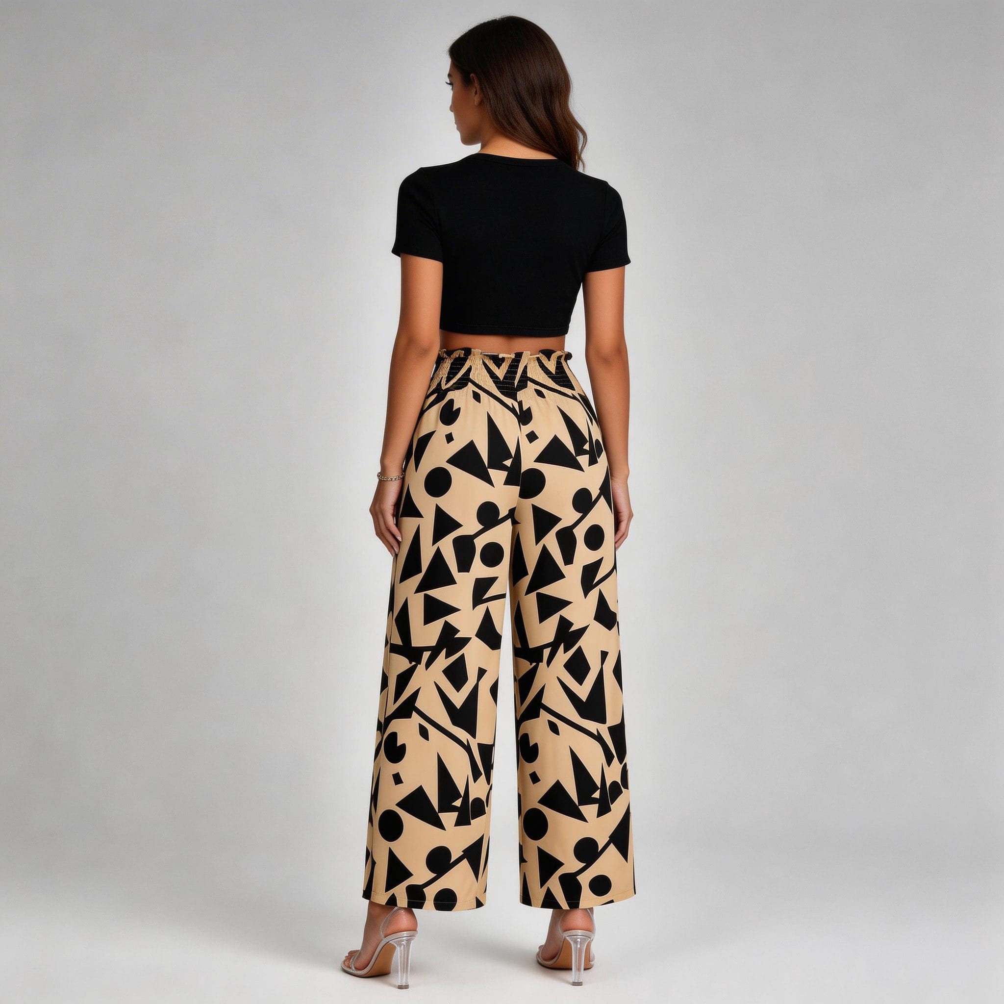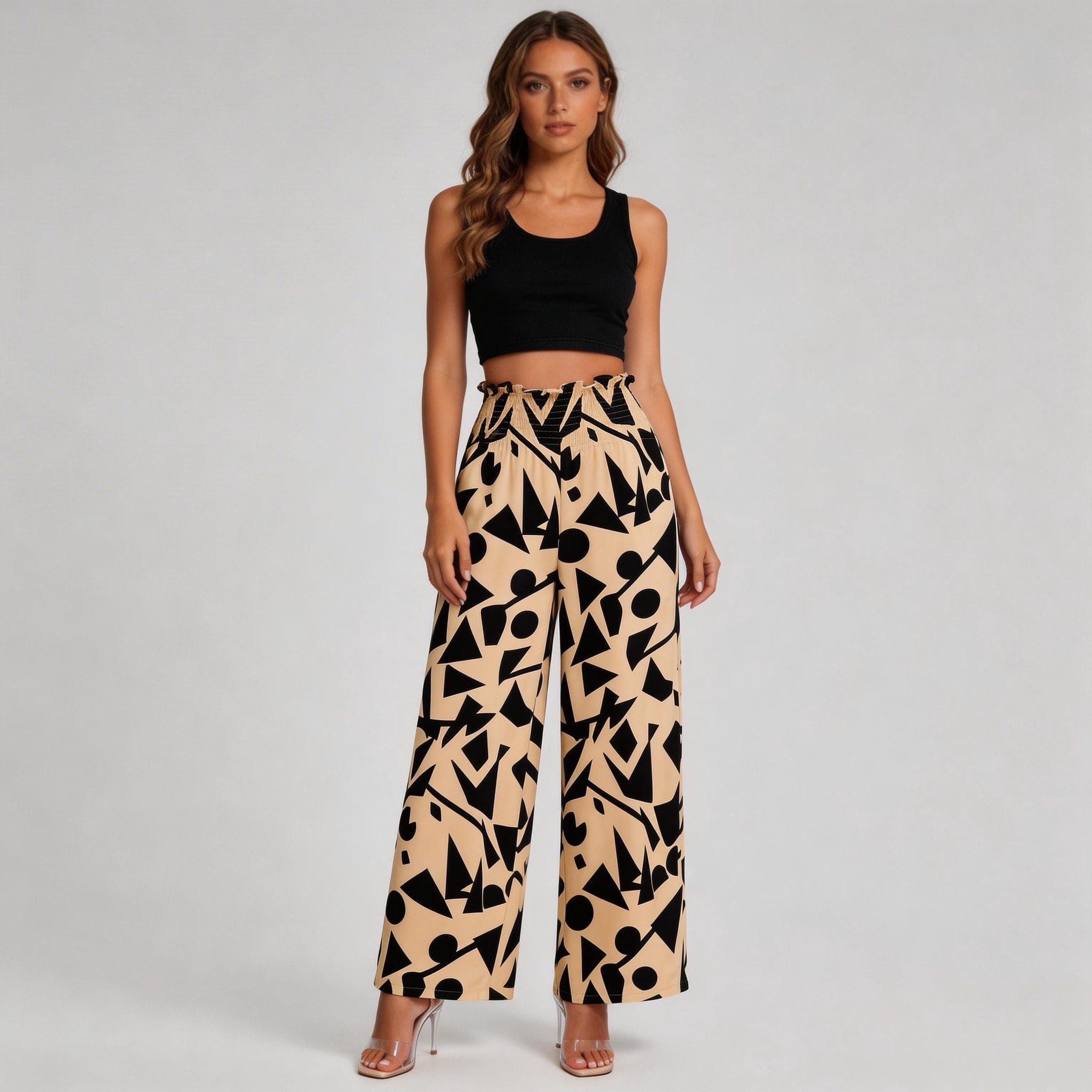 Pair these geometric print pants with a black sleeveless crop top for a chic and modern look. Style them with a white tank top and sandals for a relaxed, casual vibe. Elevate the outfit with clear high-heeled sandals and minimalist jewelry for a sophisticated touch.