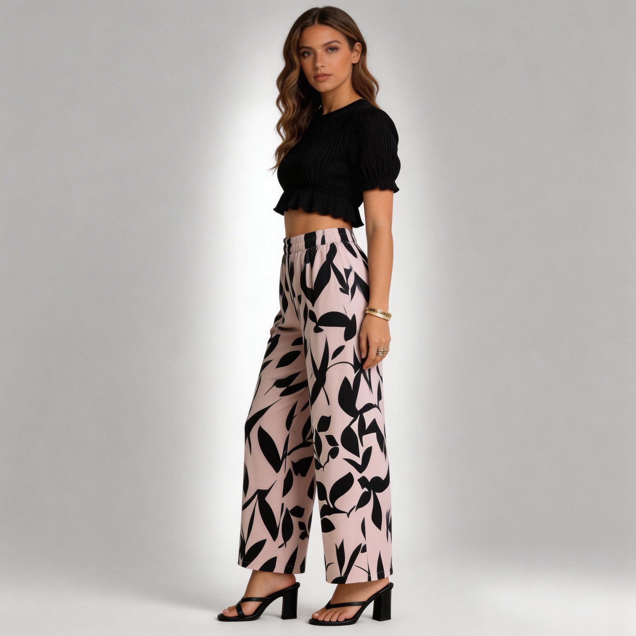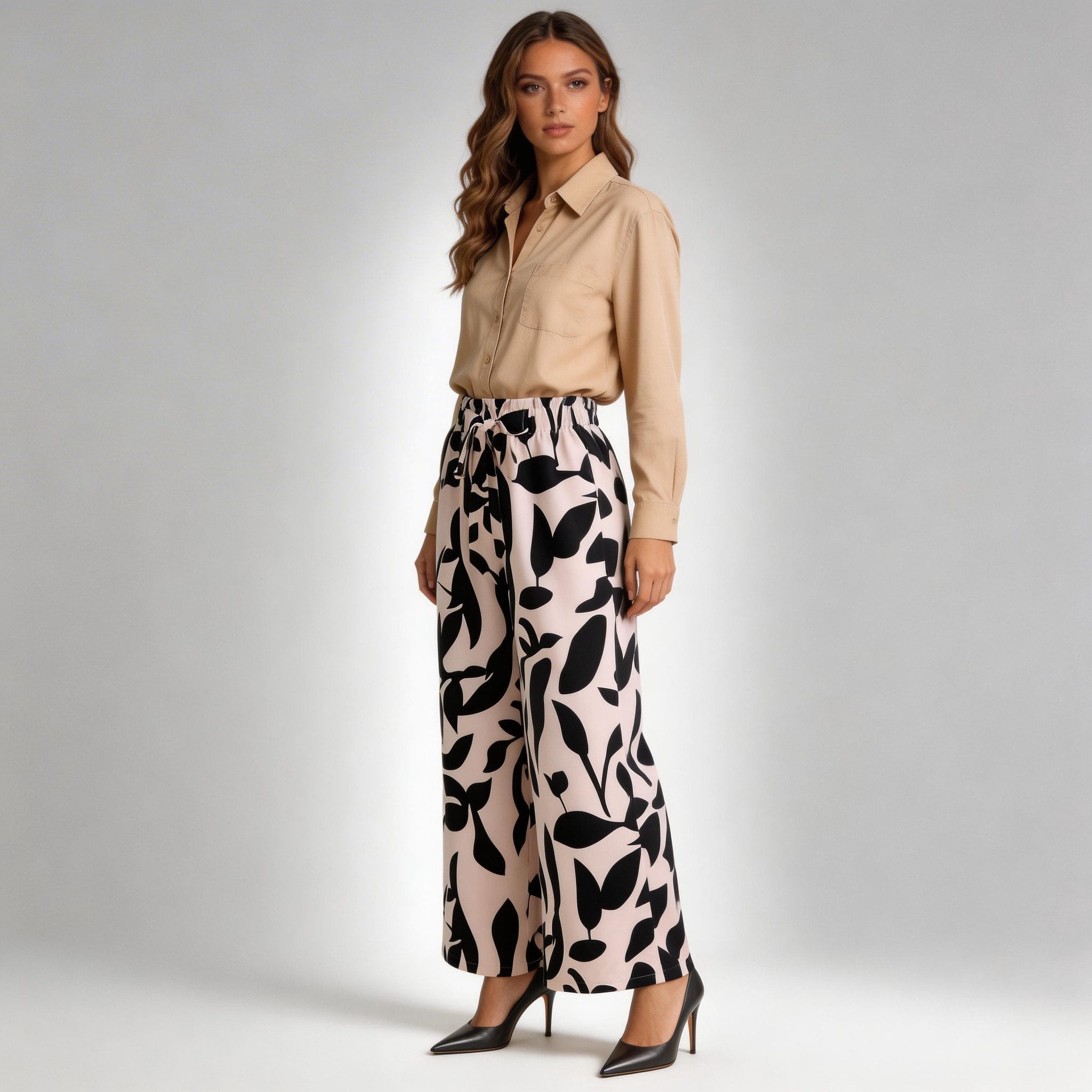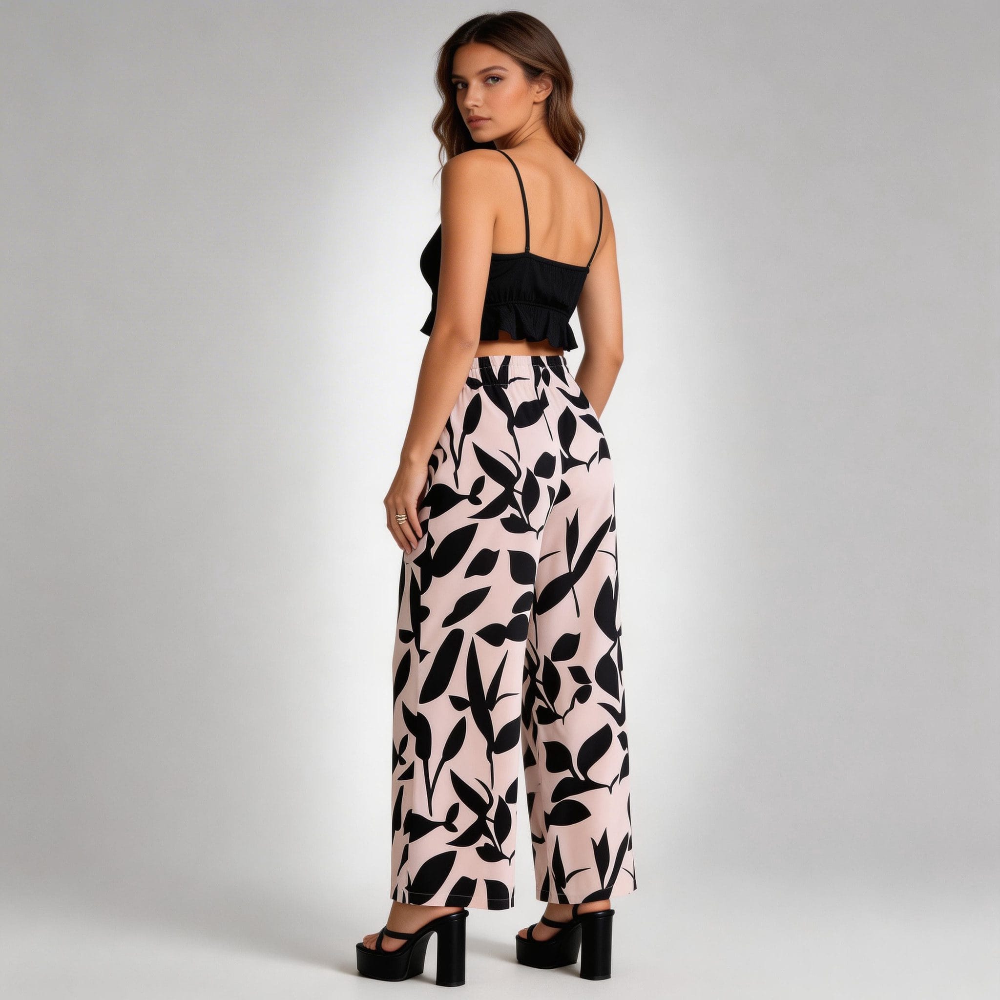 These wide-leg pants feature a striking abstract print in bold black against a soft blush background, creating a modern and artistic look. The wide-leg silhouette adds a touch of elegance and movement, making these pants a standout piece in any wardrobe.
