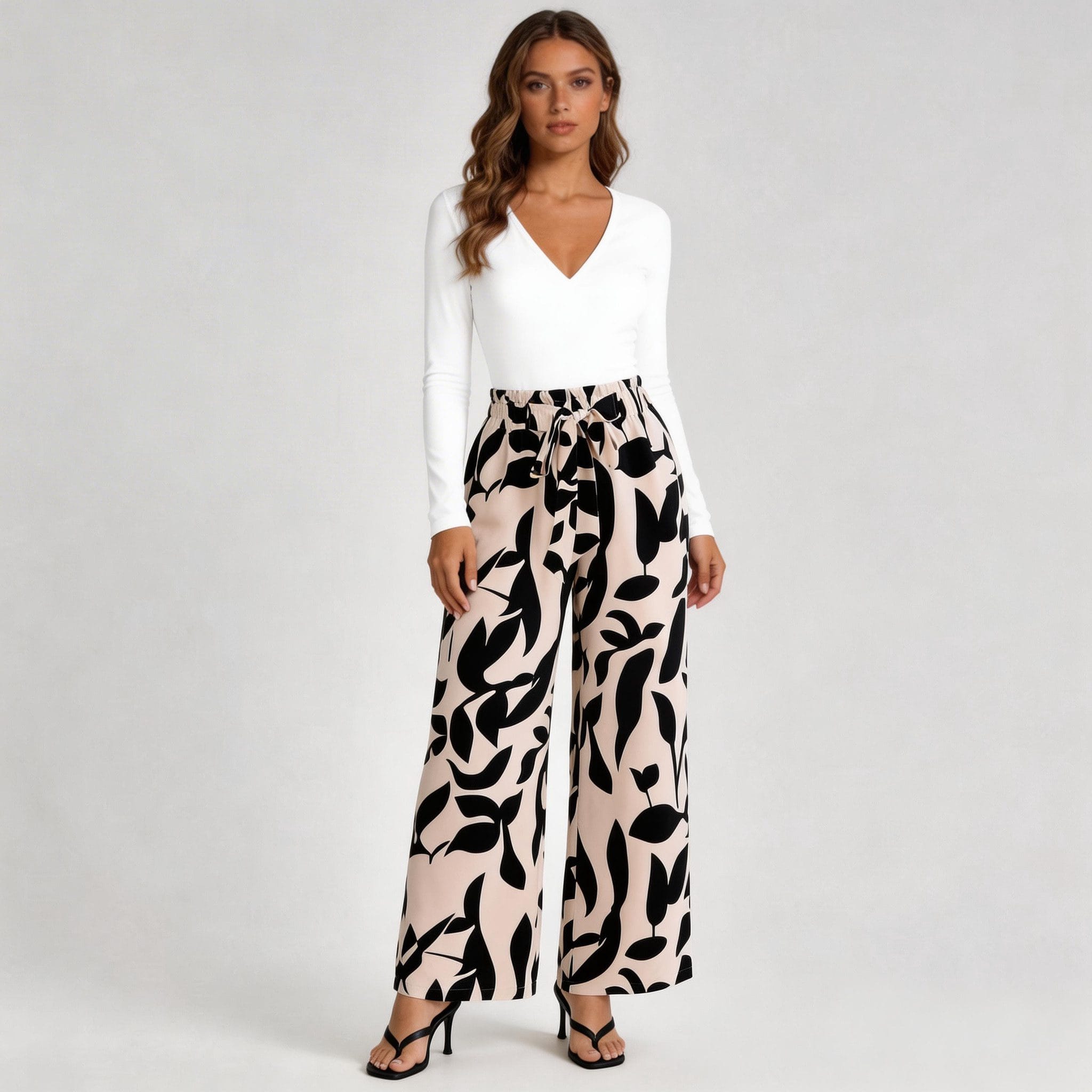 Pair these abstract print pants with a black spaghetti top and black heels for a chic, monochromatic look. Style them with a black ruffled crop top for a playful, feminine vibe. Combine with a white V-neck bodysuit for a polished, versatile outfit, or wear with a beige button-up shirt for a sophisticated, office-ready appearance.