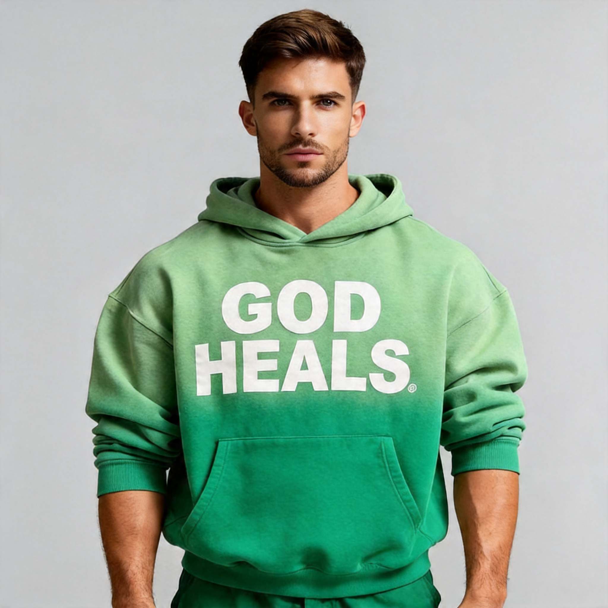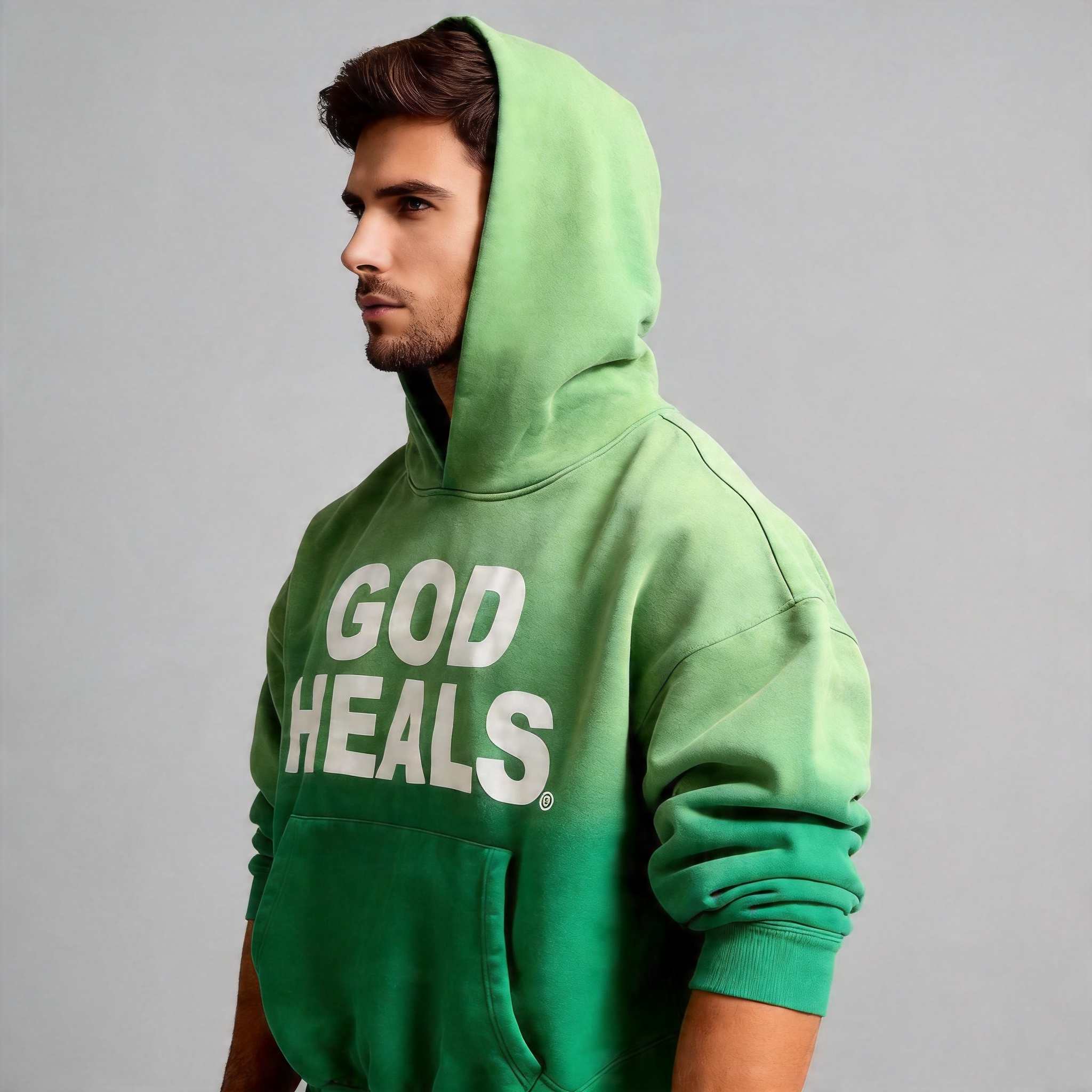 Make a bold statement of faith and style with our “GOD HEALS” Gradient Green Heavyweight Hoodie. This hoodie features a vibrant green gradient design that transitions from a lighter shade at the top to a deeper green at the bottom, with the powerful message “GOD HEALS” prominently displayed in large, white block letters across the chest. Crafted from premium heavyweight cotton, this hoodie offers exceptional comfort, warmth, and durability, making it a perfect choice for casual wear or as a meaningful addition to your streetwear collection. Available for OEM & wholesale orders with a low MOQ of 100 pieces.
