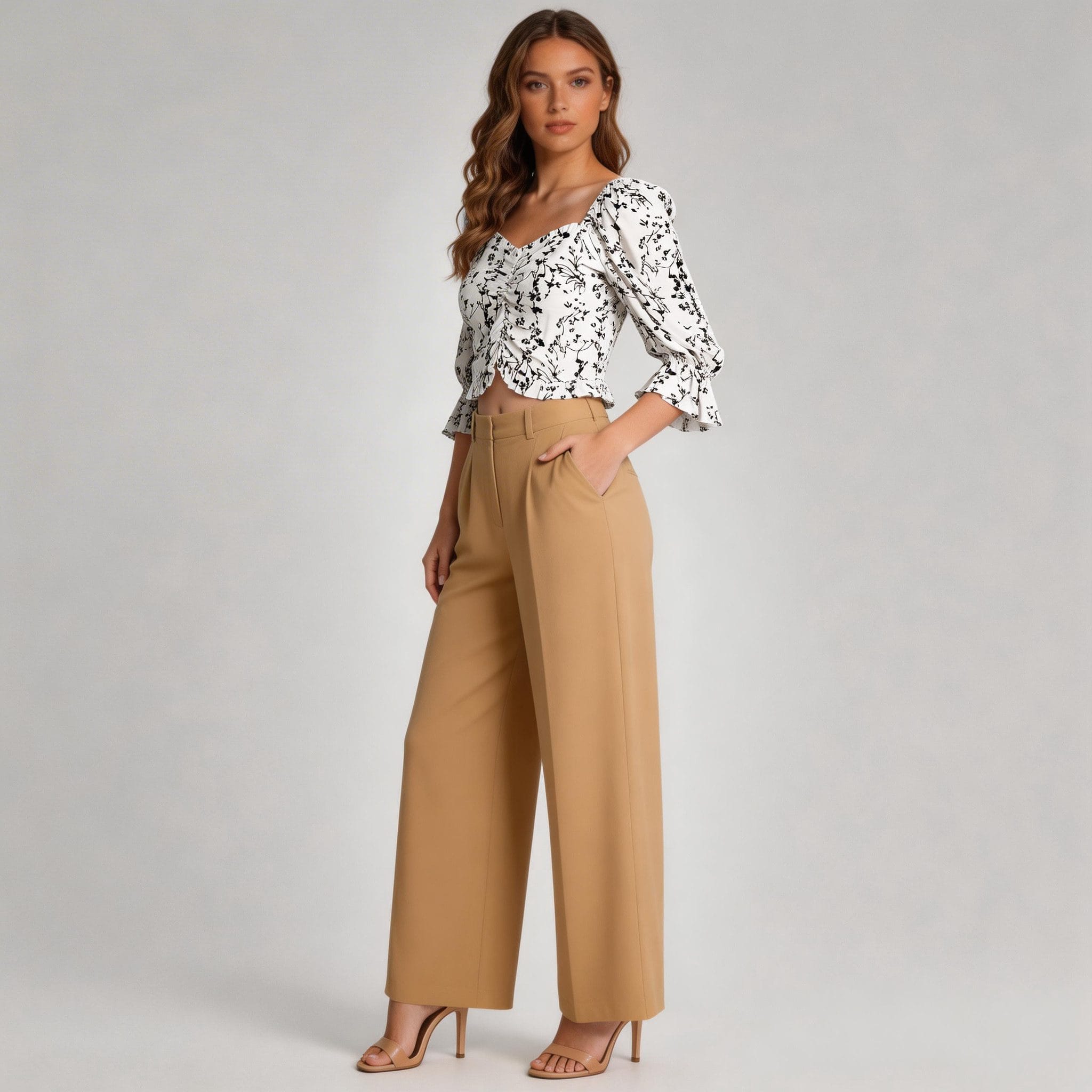 Pair with Wide-Leg Trousers: For a sophisticated and polished look, pair this floral crop top with beige wide-leg trousers. This combination is ideal for office settings, business meetings, or lunch dates.