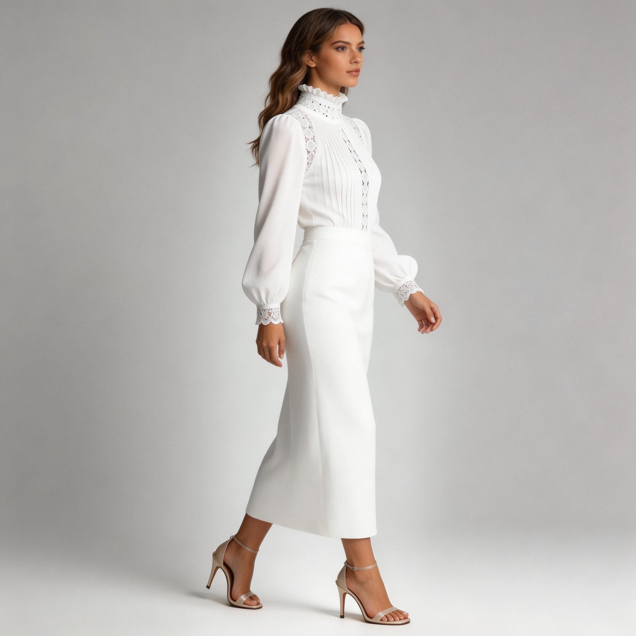 Long Puff Sleeves: Designed with long puff sleeves, this blouse exudes a romantic and whimsical vibe. The sleeves are finished with lace cuffs, adding a delicate and feminine detail that complements the high-neck design.
