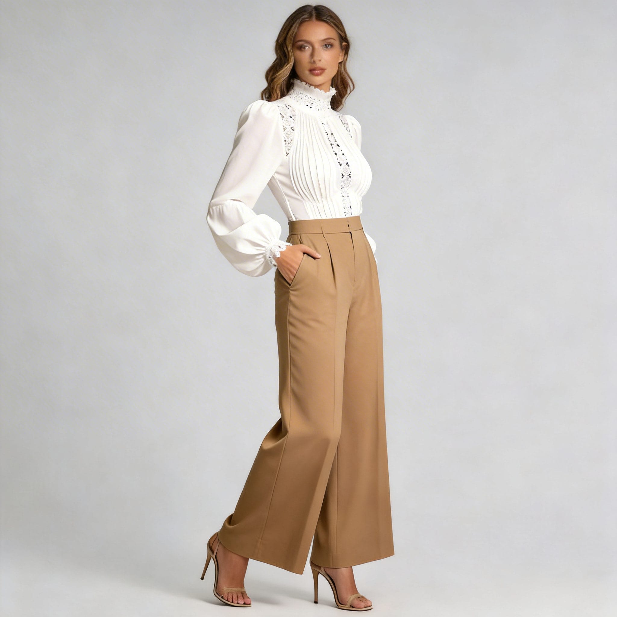 Pair with Wide-Leg Trousers: For a polished, professional look, pair this elegant blouse with beige wide-leg trousers. This combination is perfect for office settings or business meetings, offering a blend of sophistication and style.