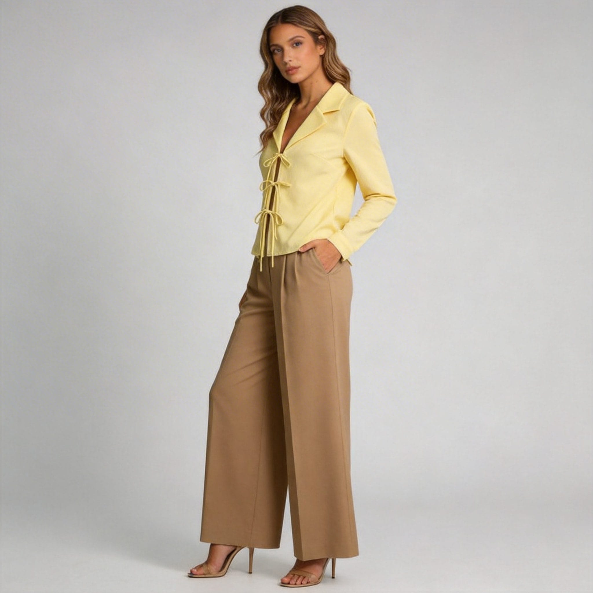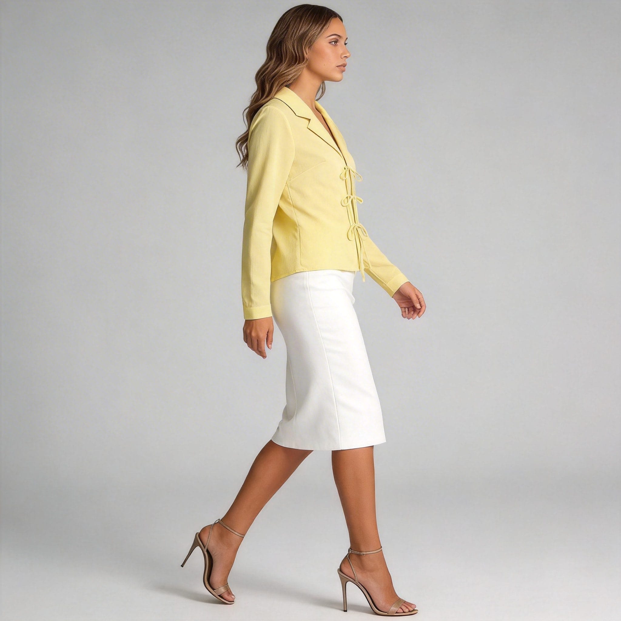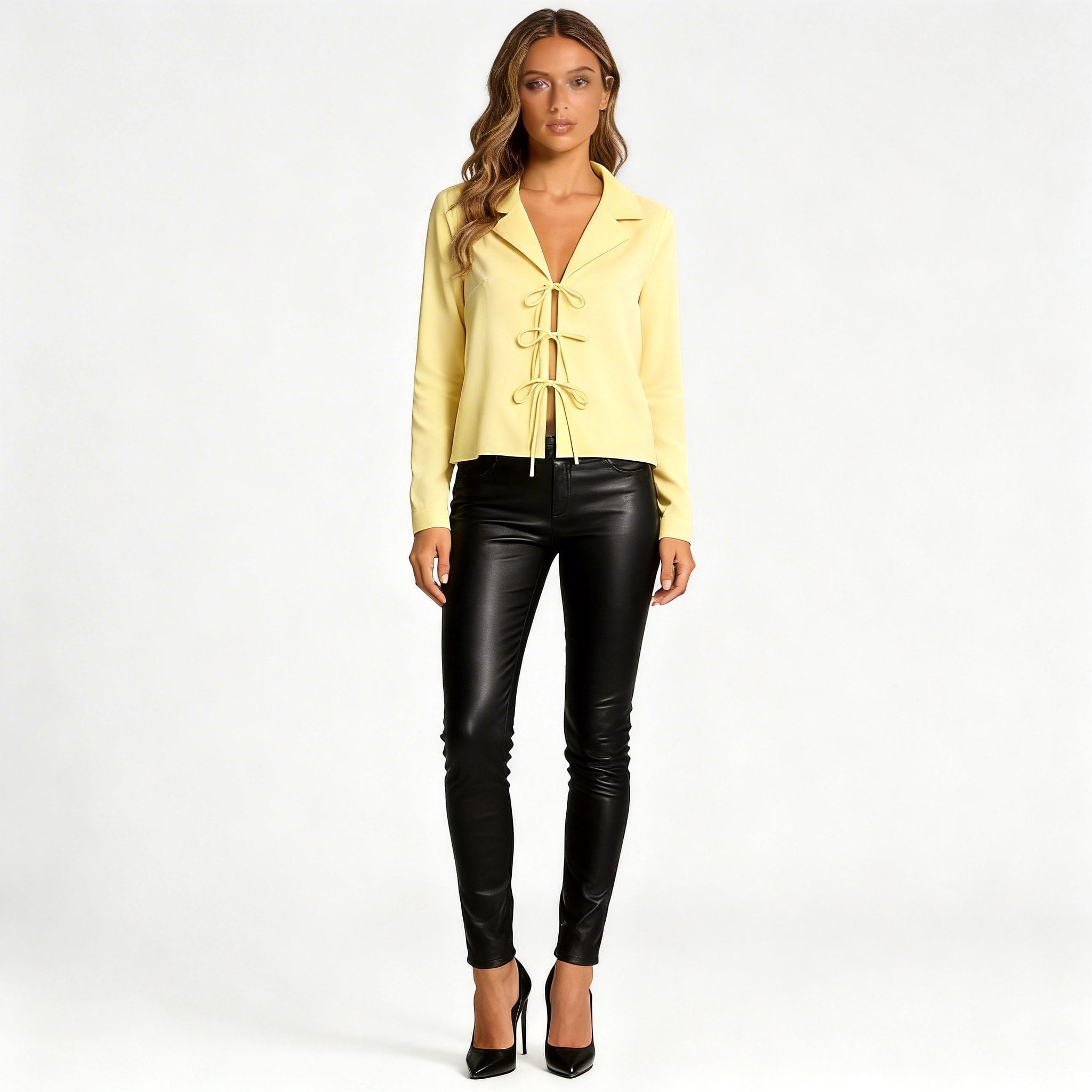 Pair with Black Leather Pants: For an edgy yet chic look, pair this yellow blouse with black leather pants. This combination balances the blouse’s vibrancy with a modern, rock-inspired vibe.