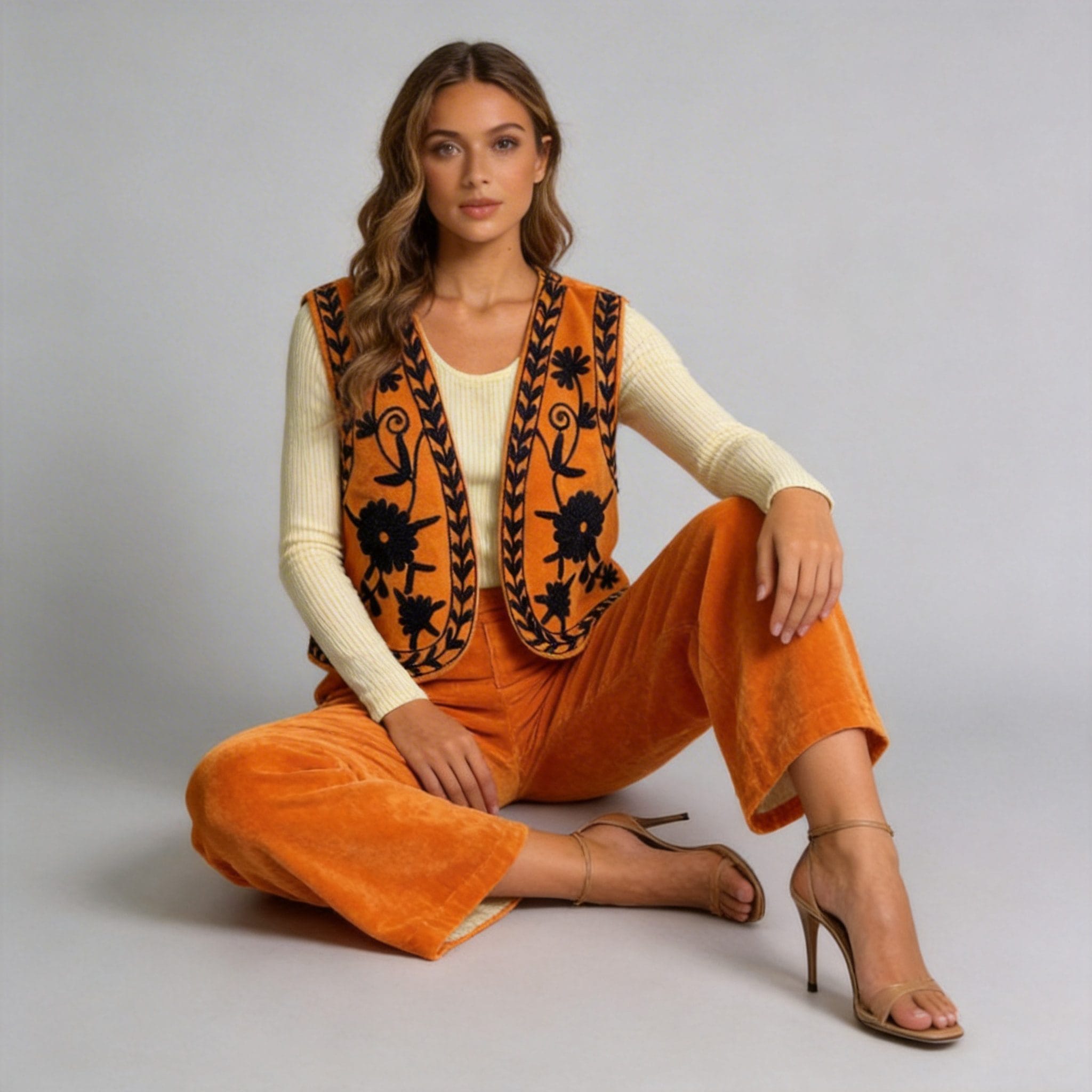 Material: This elegant vest is made from a high-quality, velvet-inspired material, showcasing delicate embroidered floral designs in a striking black on a vibrant orange background, providing a plush and upscale appearance. We offer a wide range of custom fabric choices to suit your precise needs.