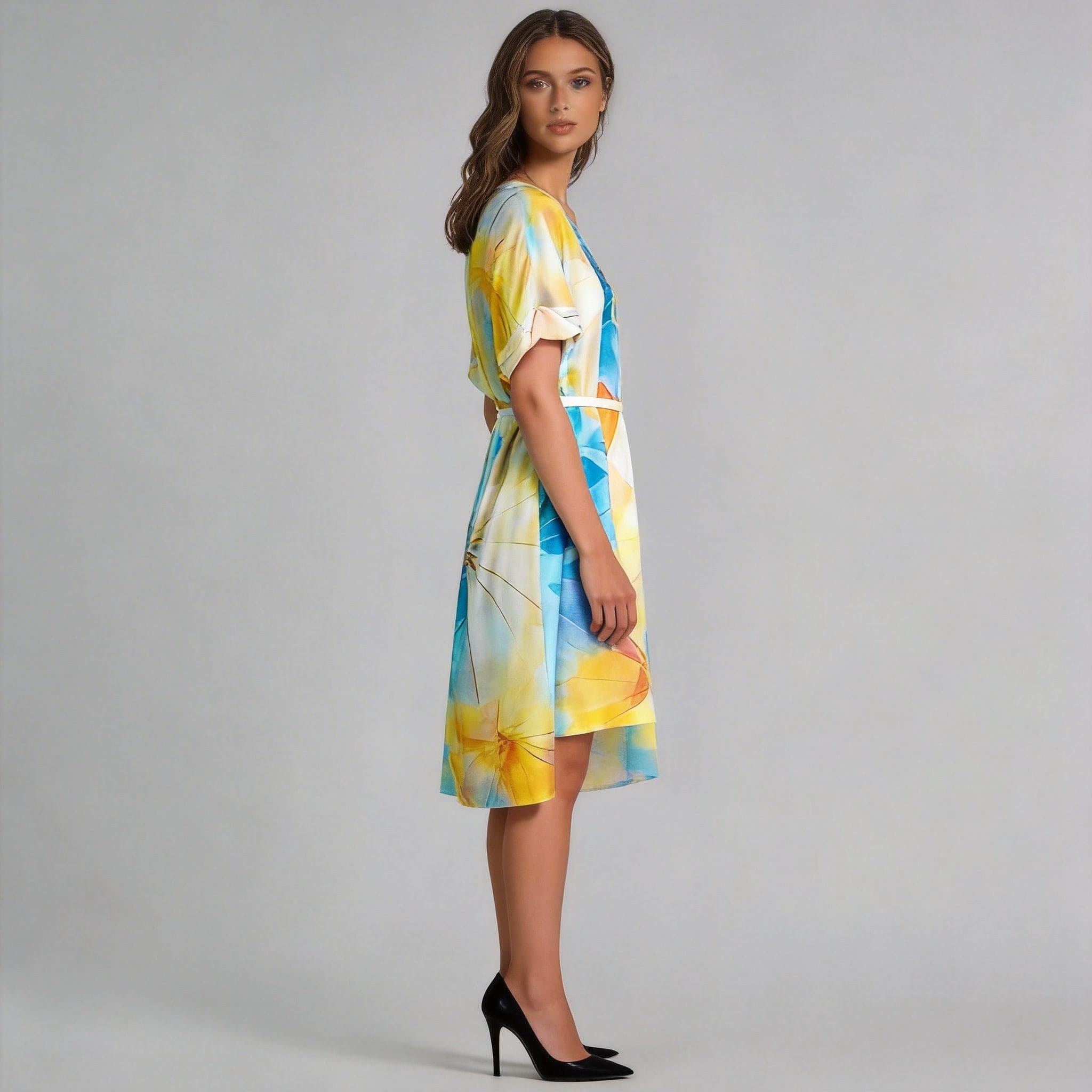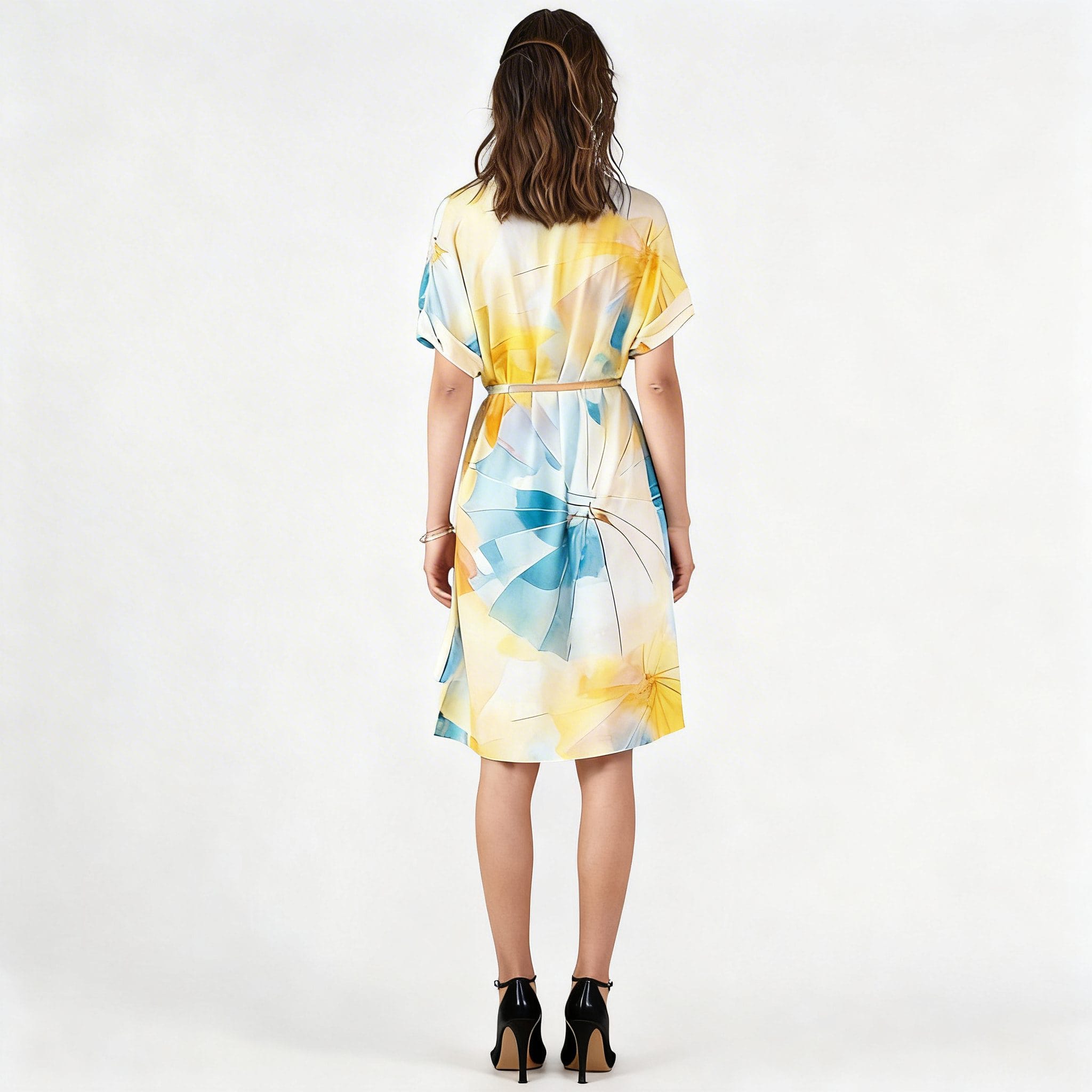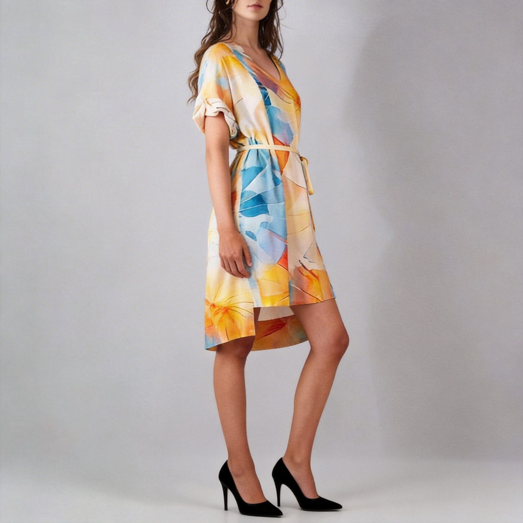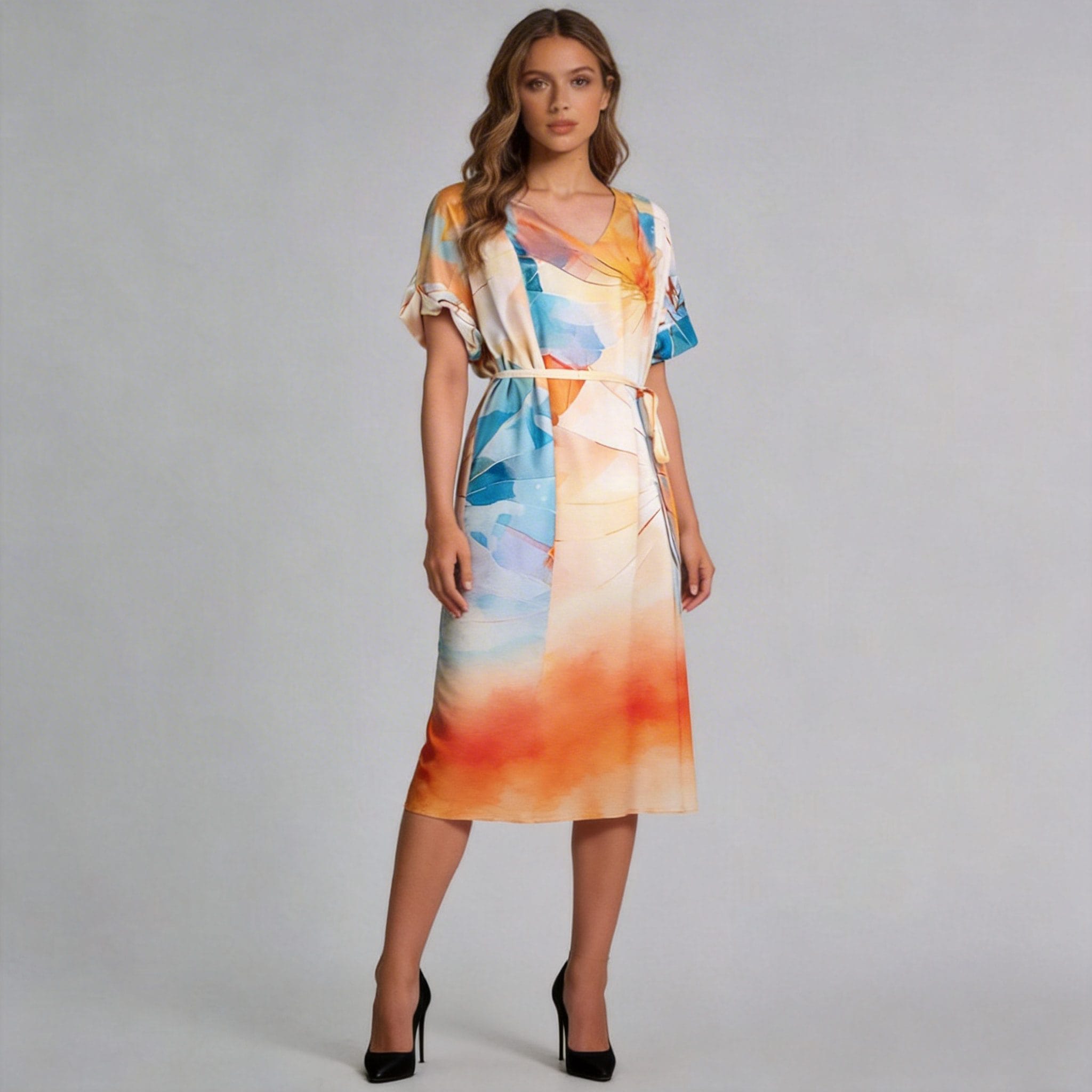 Woven Digital Print Dress Manufacturer OMJ Apparel presents this stunning abstract print midi dress. Elevate your brand's collection with this elegant belted waist design featuring vibrant watercolor patterns and premium woven fabric.